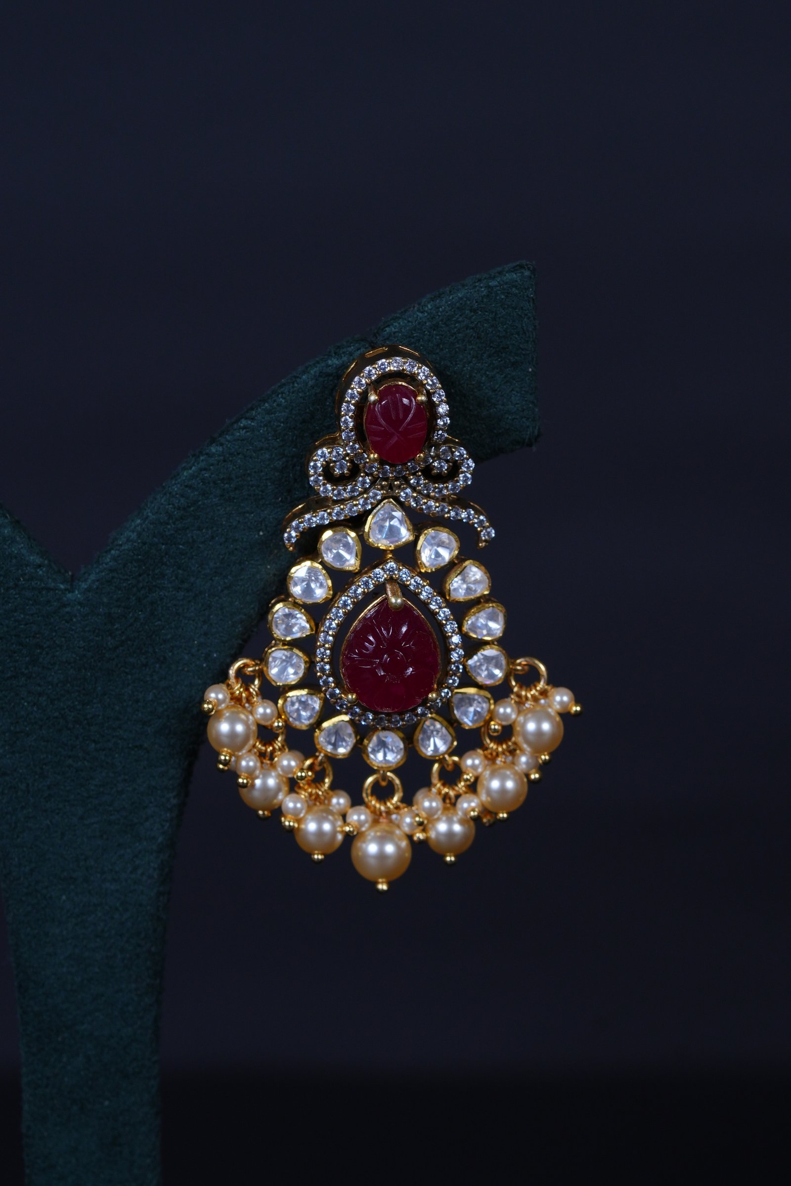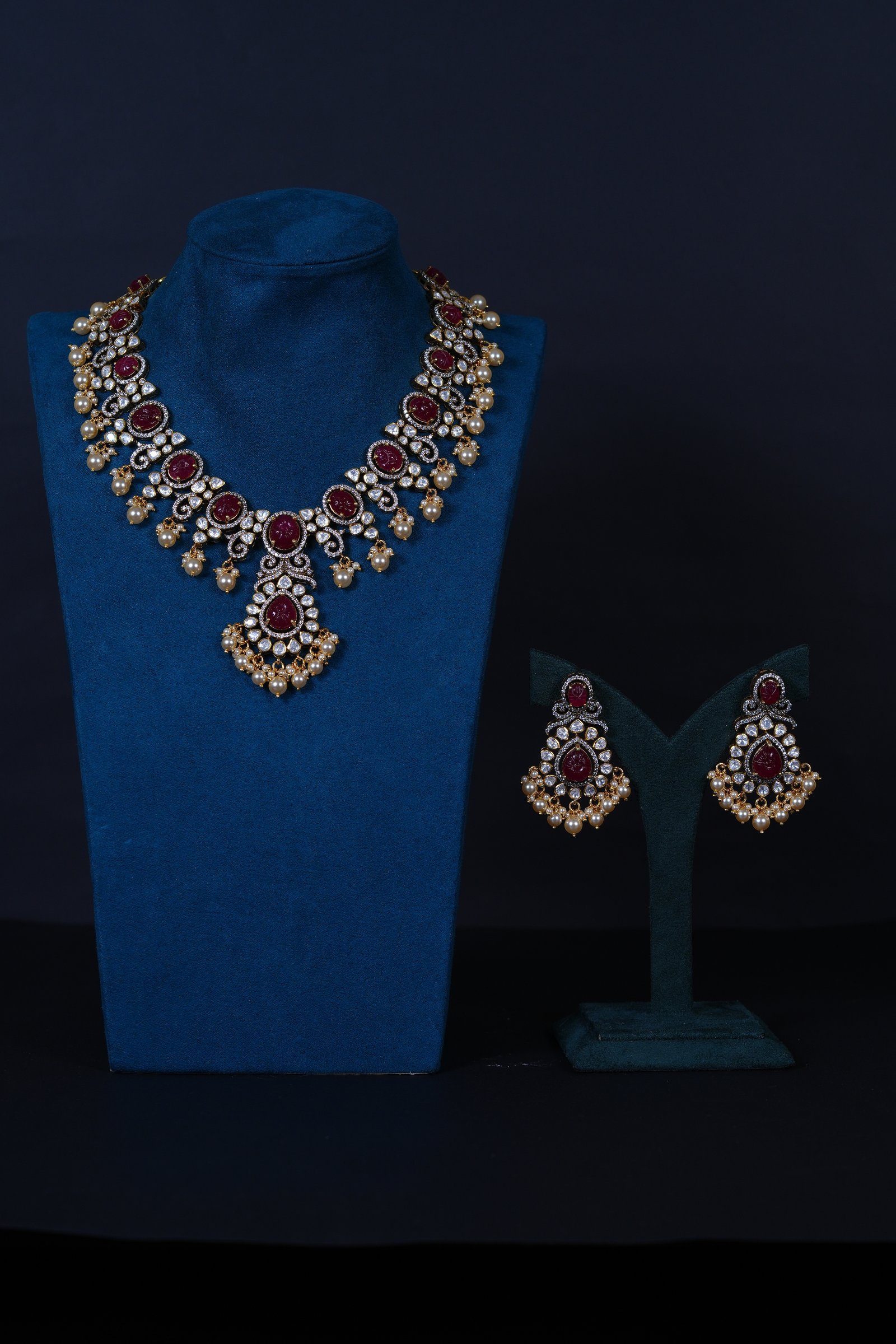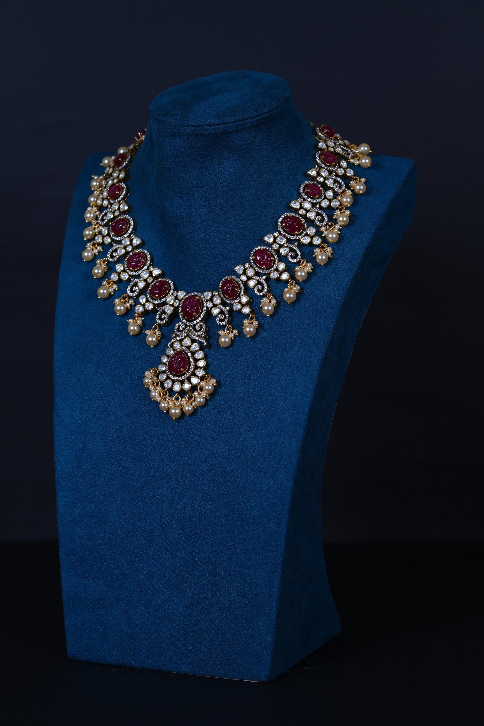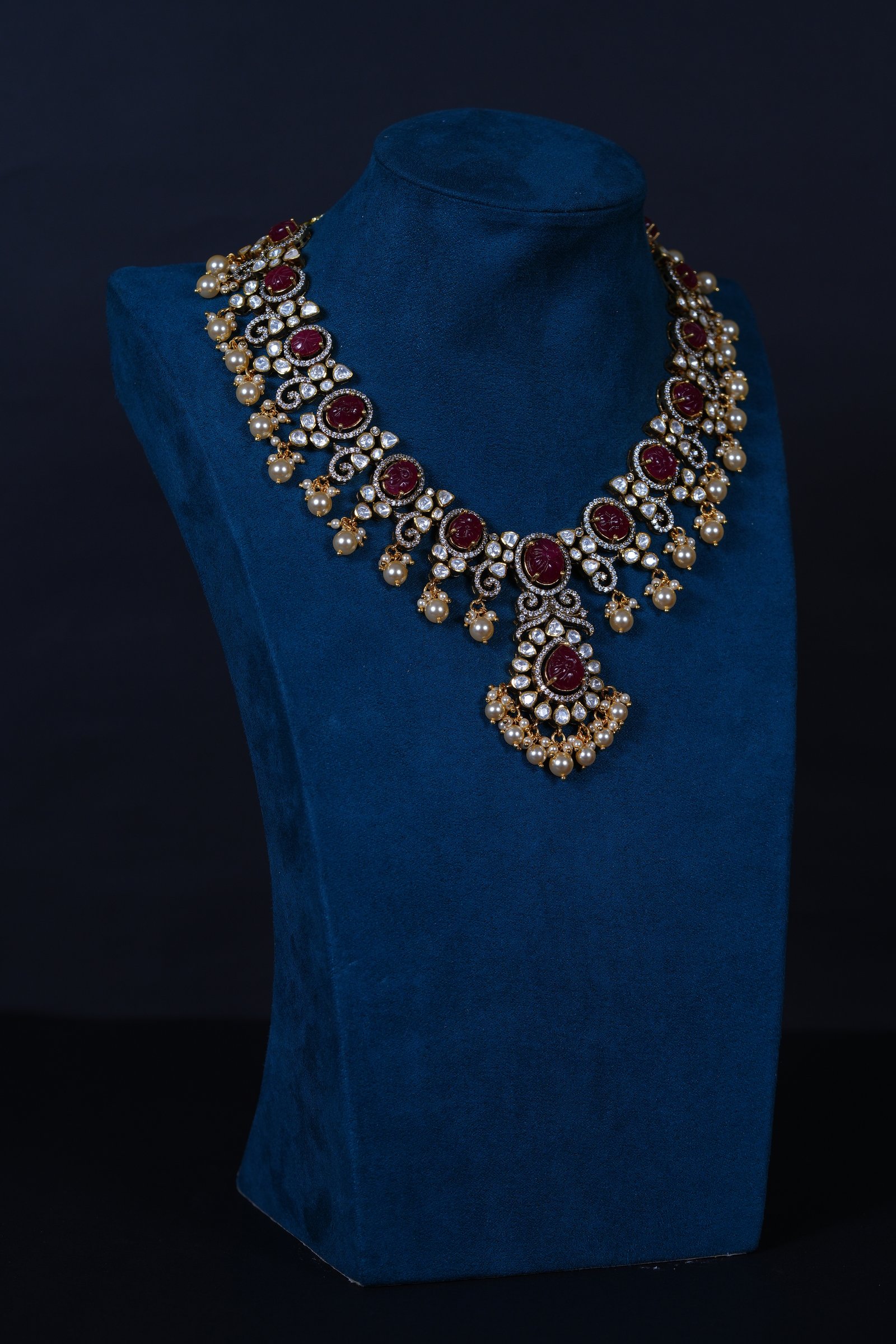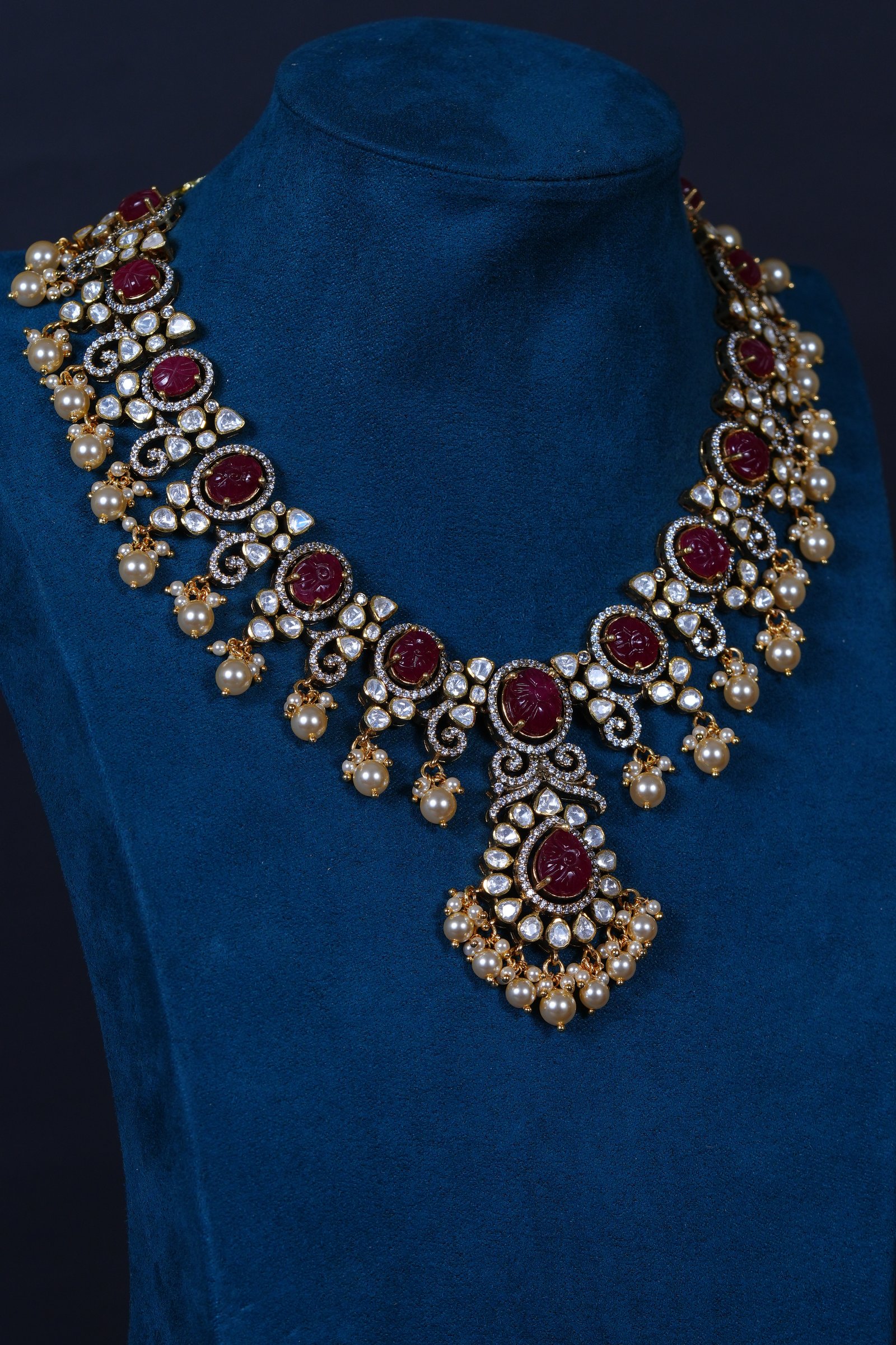 Crafted in 92.5 sterling silver, this premium moissanite necklace features a beautifully carved ruby centerpiece, accented with luminous Swarovski pearls — a timeless blend of royalty and elegance.