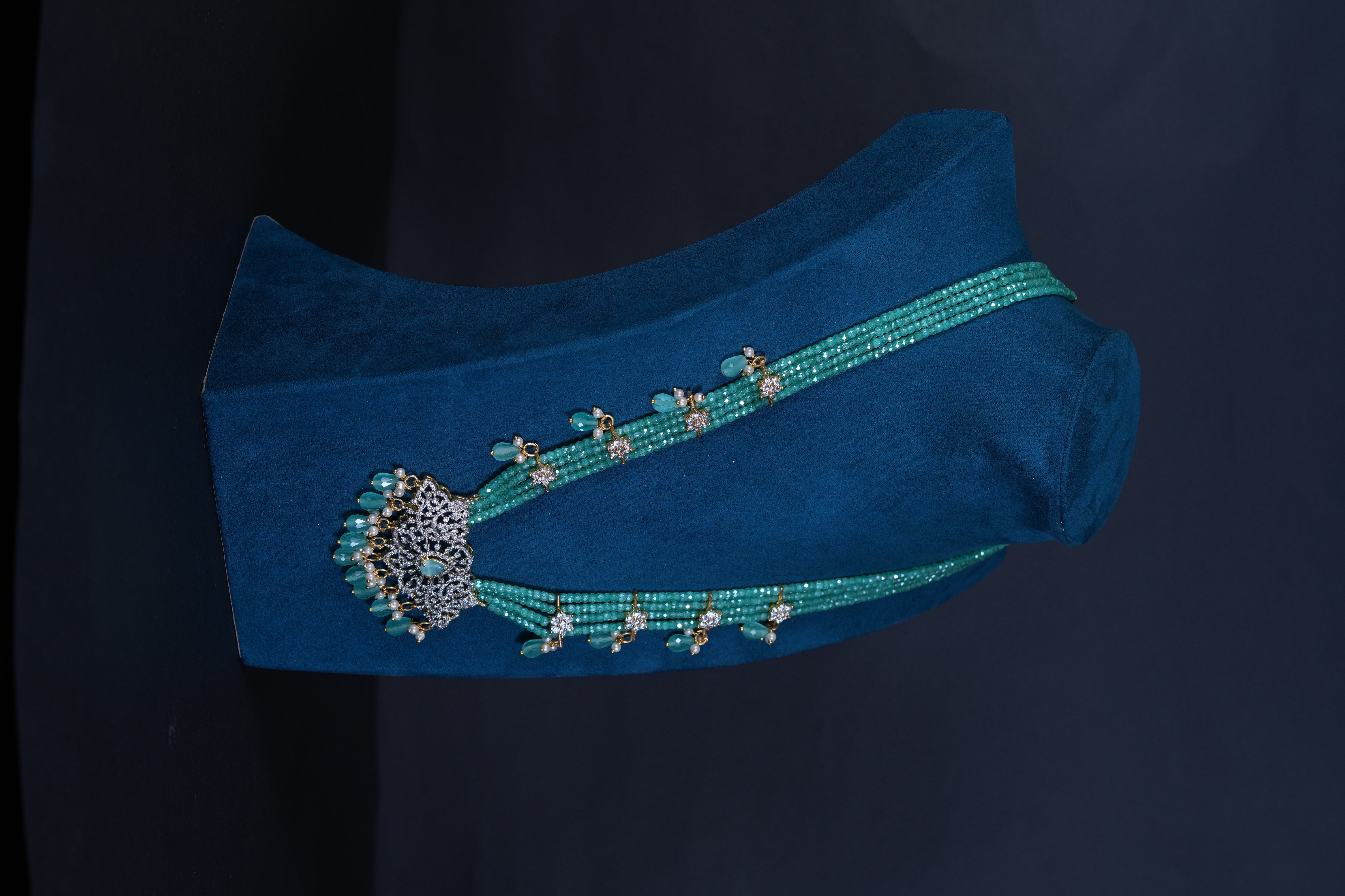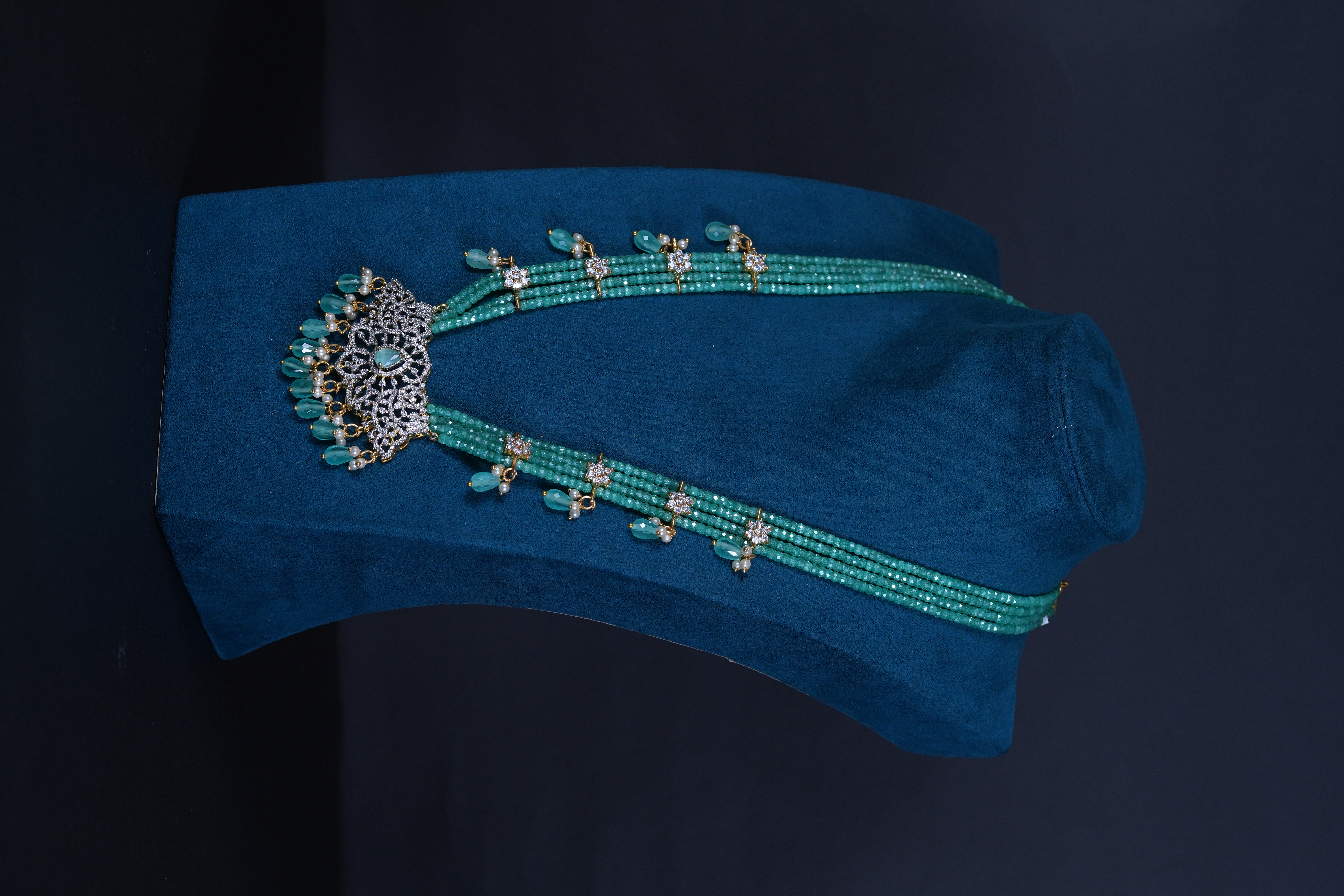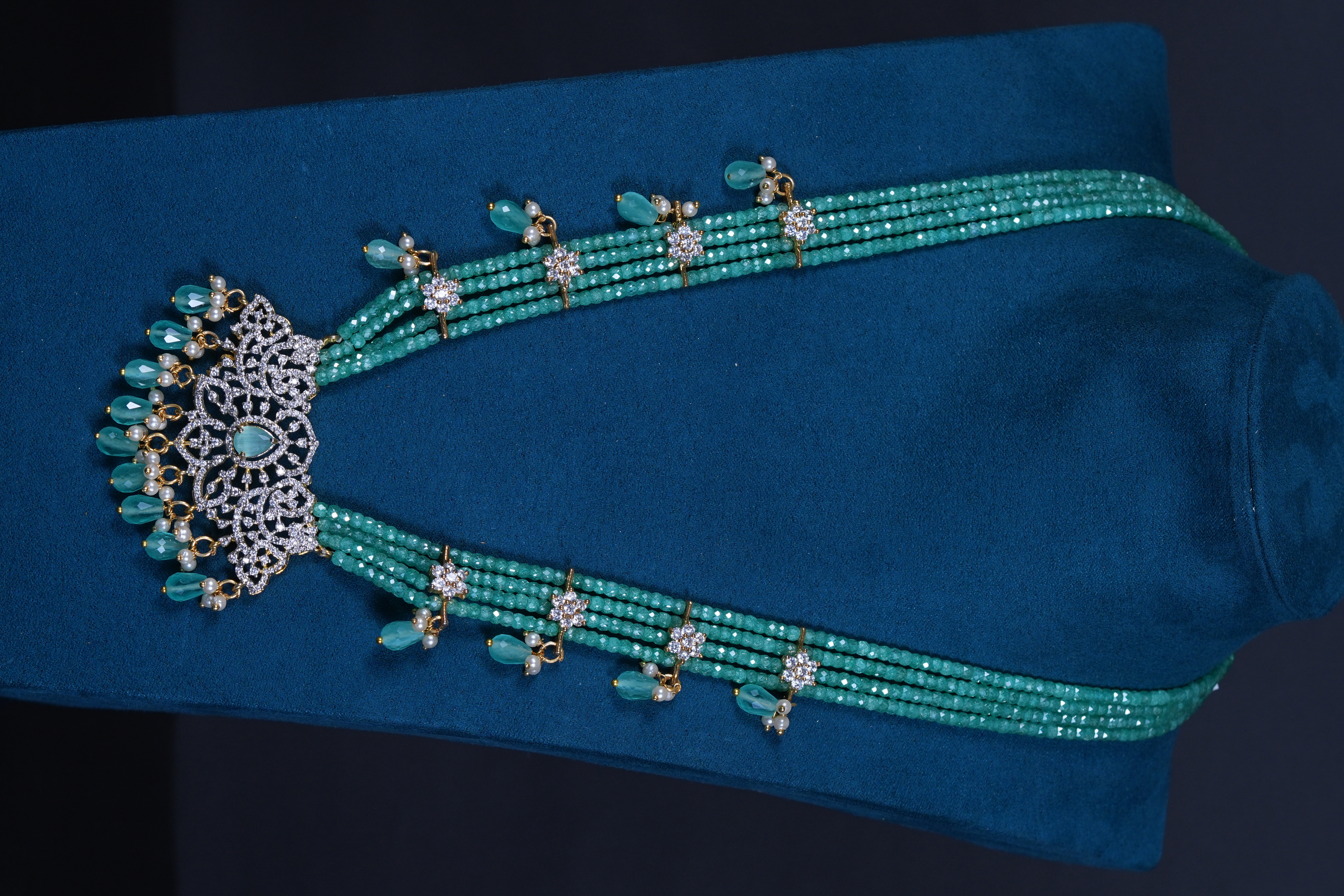 AD stone green beaded haram with matching earrings. An elegant imitation jewelry set combining radiant sparkle with rich green accents, perfect for weddings and festive occasions.