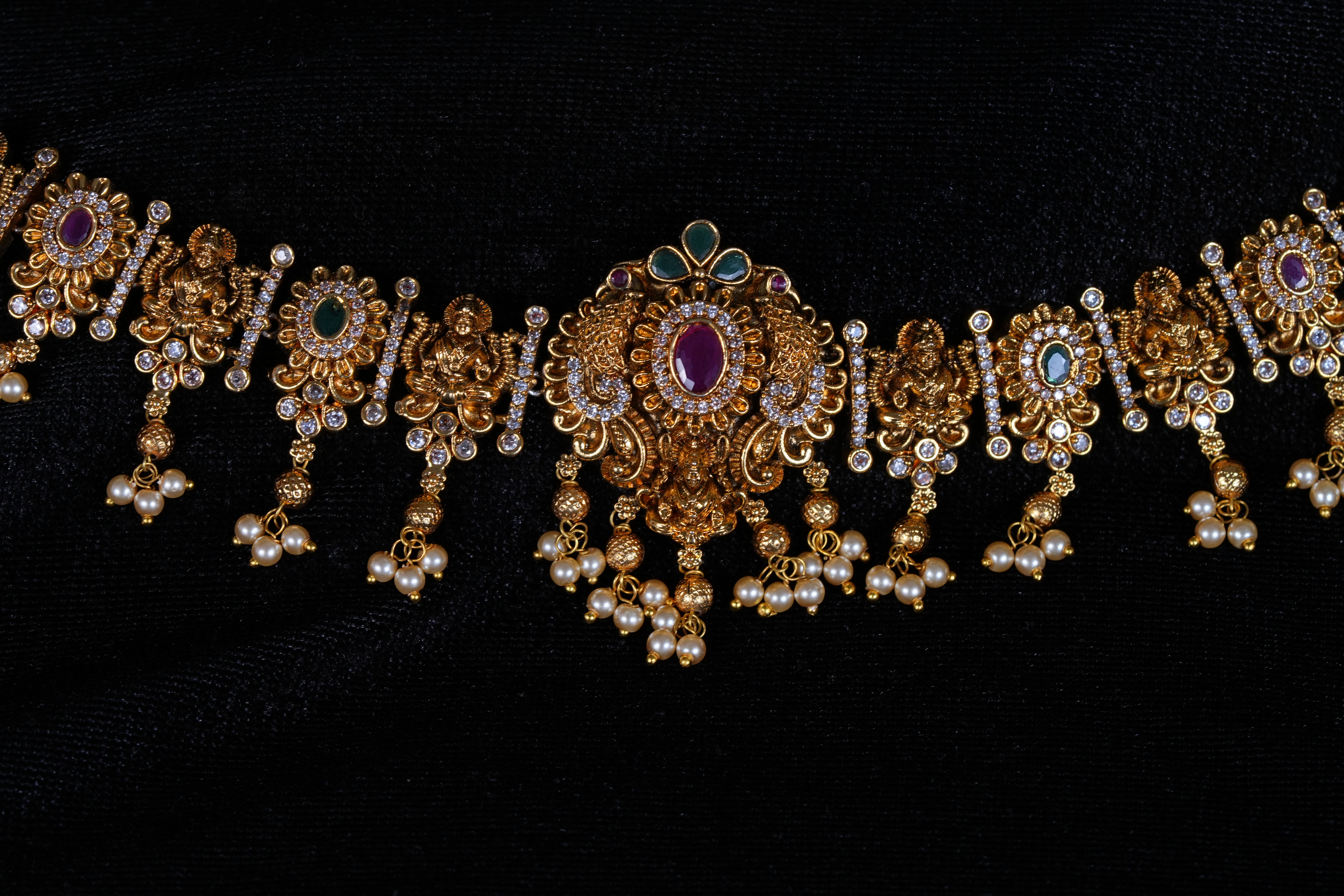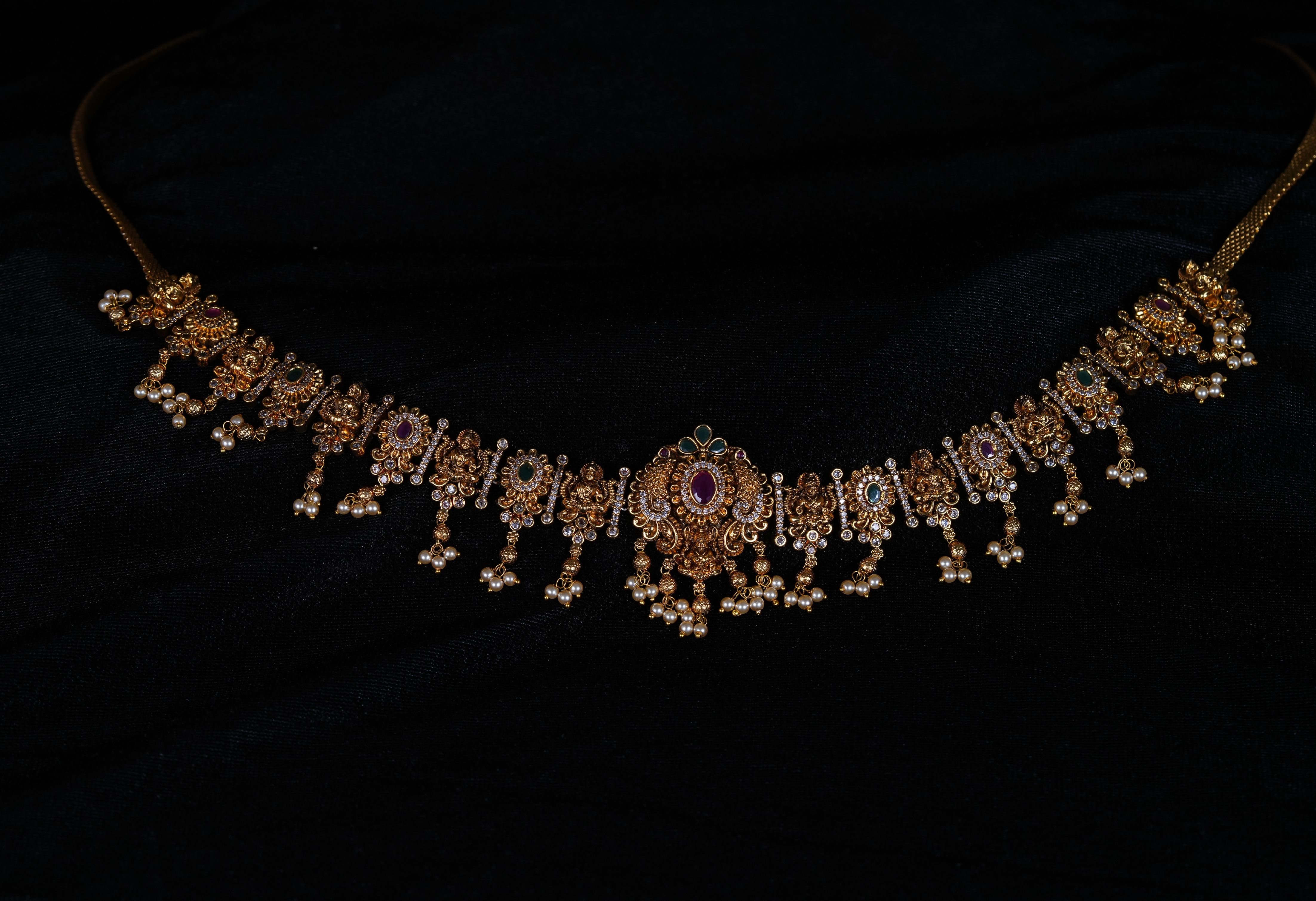 Antique Lakshmi Nakshi hip chain. A traditional imitation jewelry piece featuring detailed temple-inspired design, perfect for bridal and festive wear.