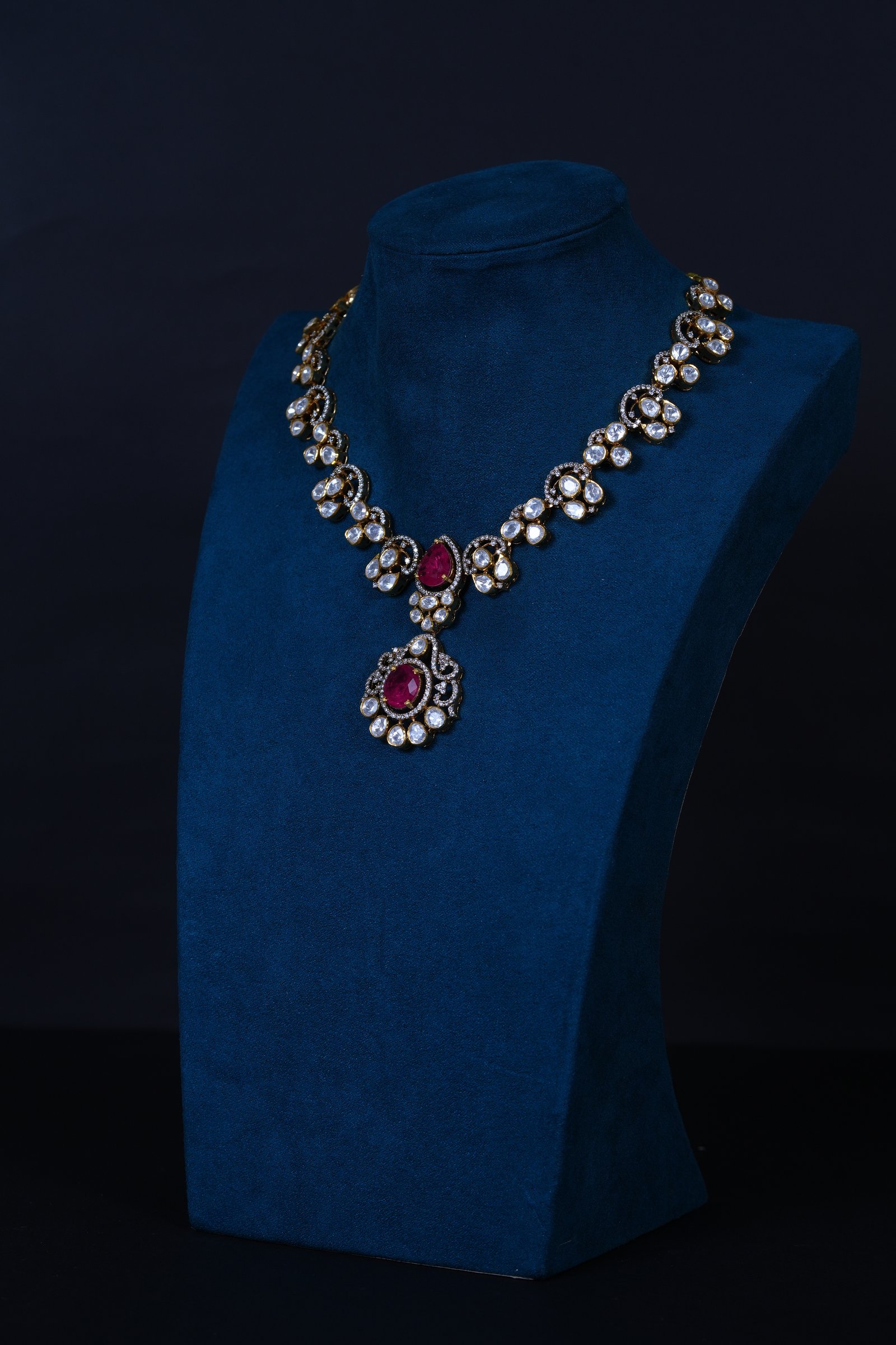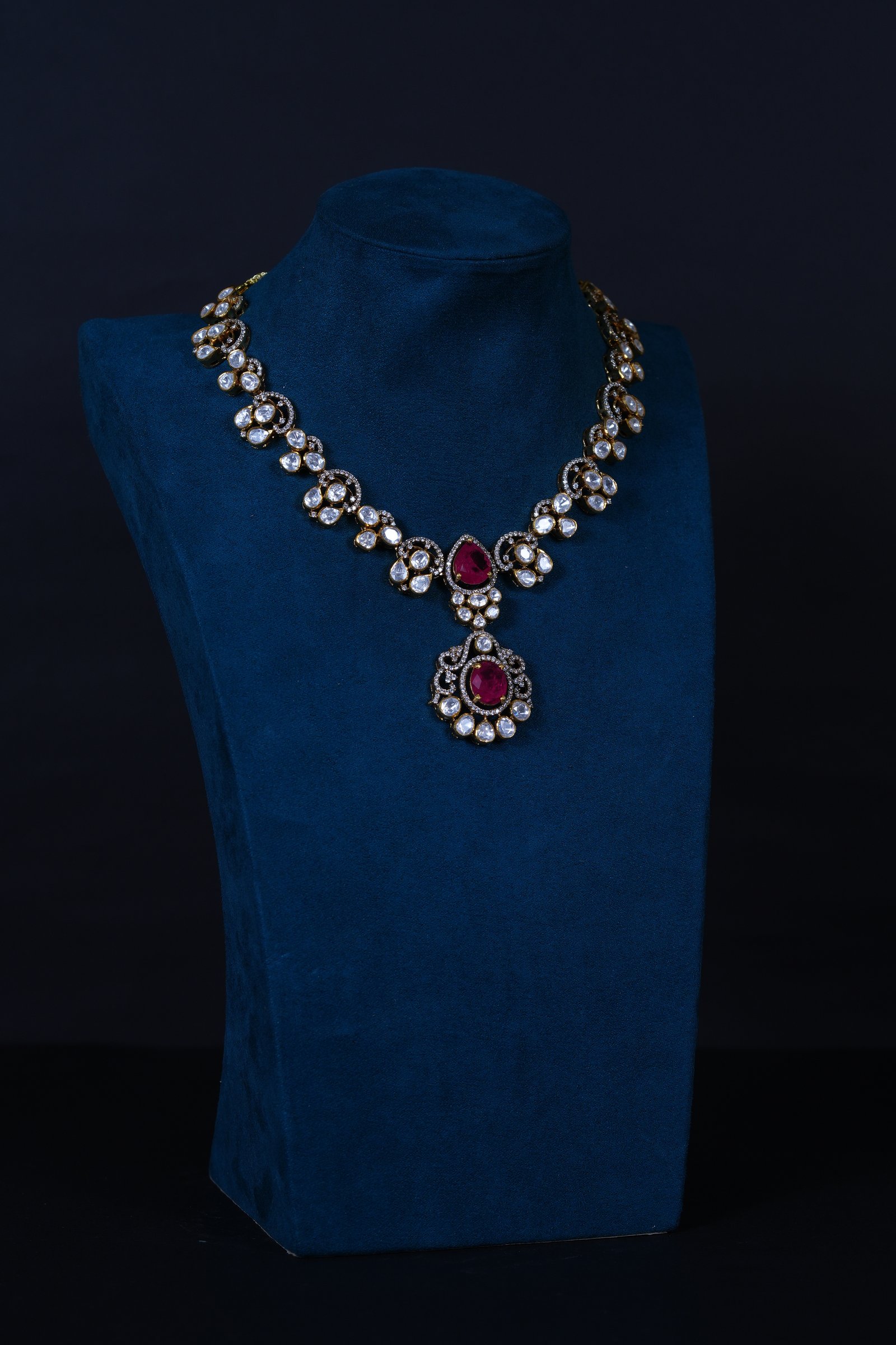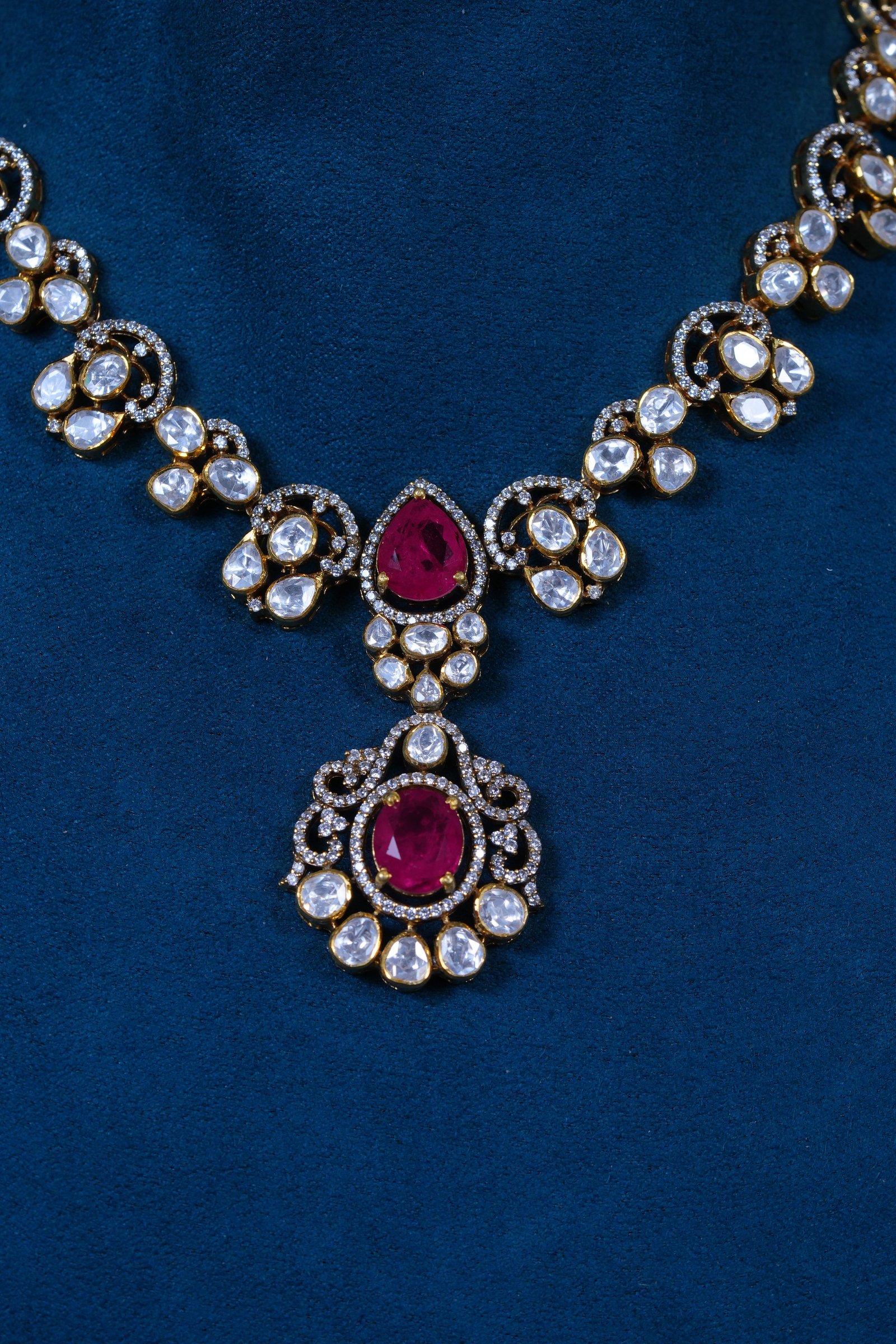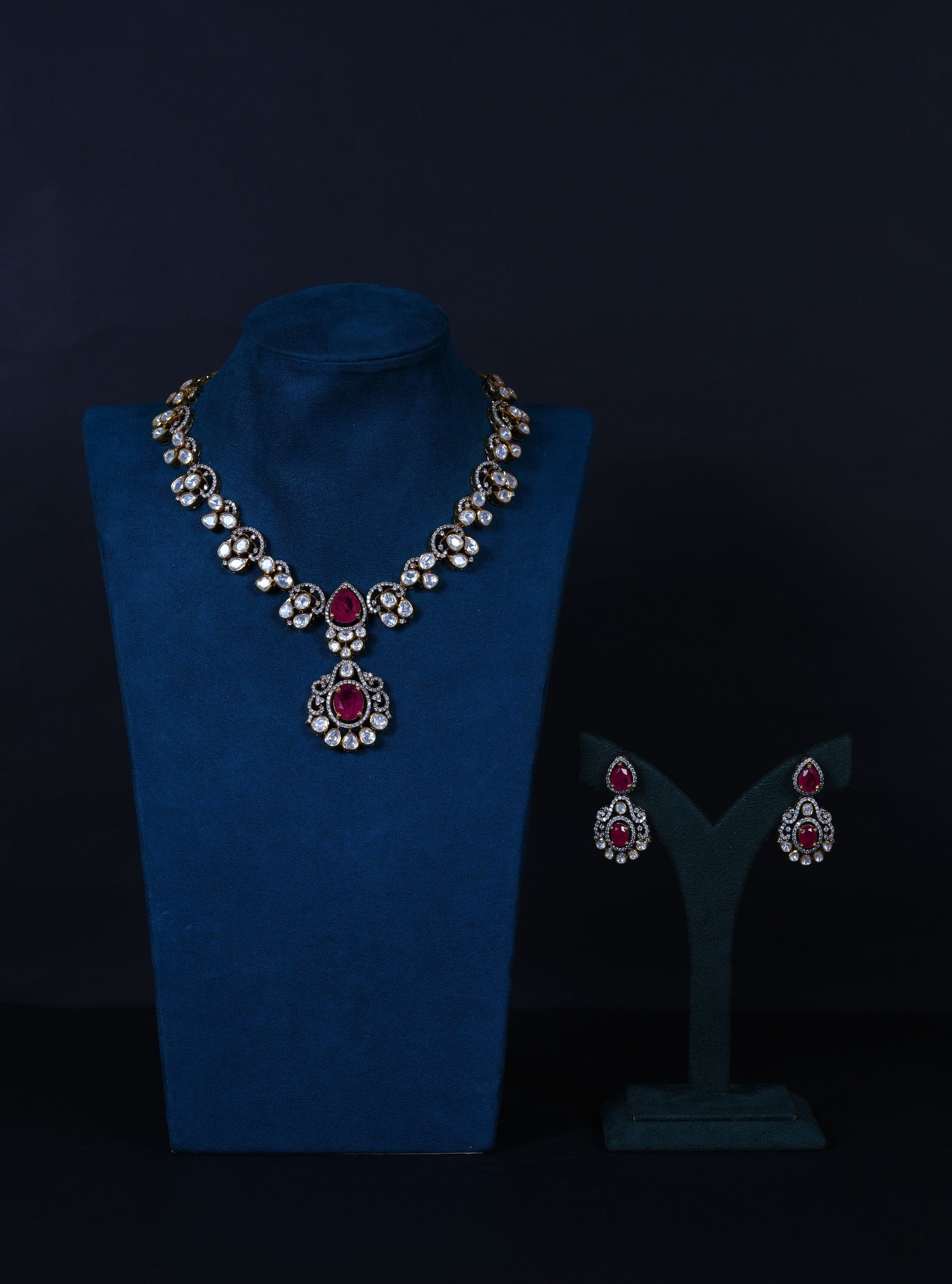 Elegant Polki Ruby necklace with matching earrings crafted in 92.5 sterling silver. A timeless design combining traditional charm with refined sparkle, perfect for weddings and festive occasions.