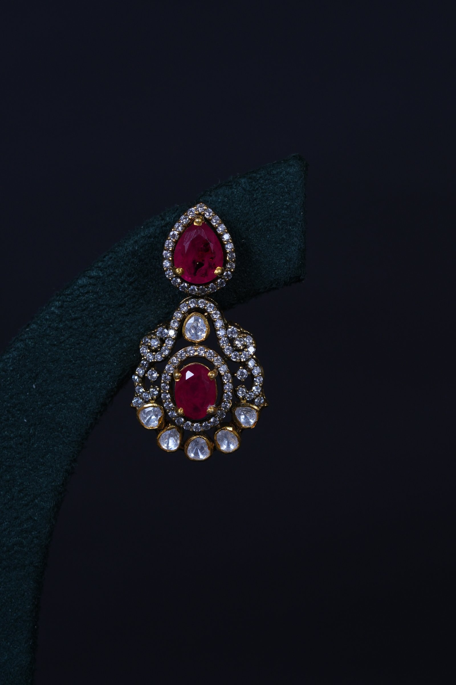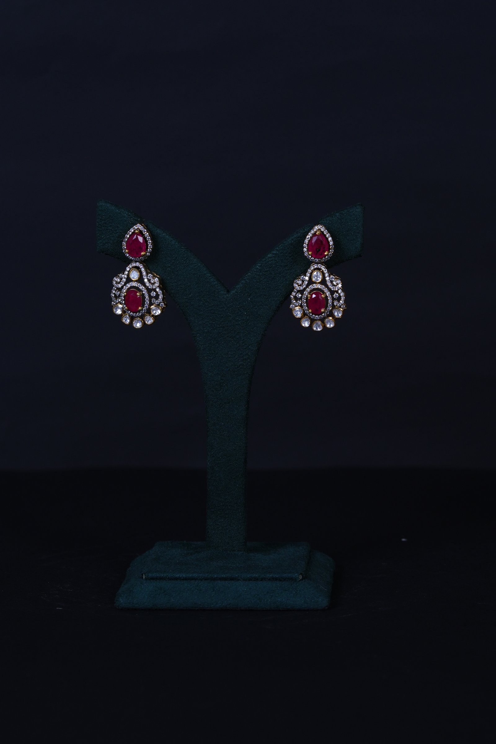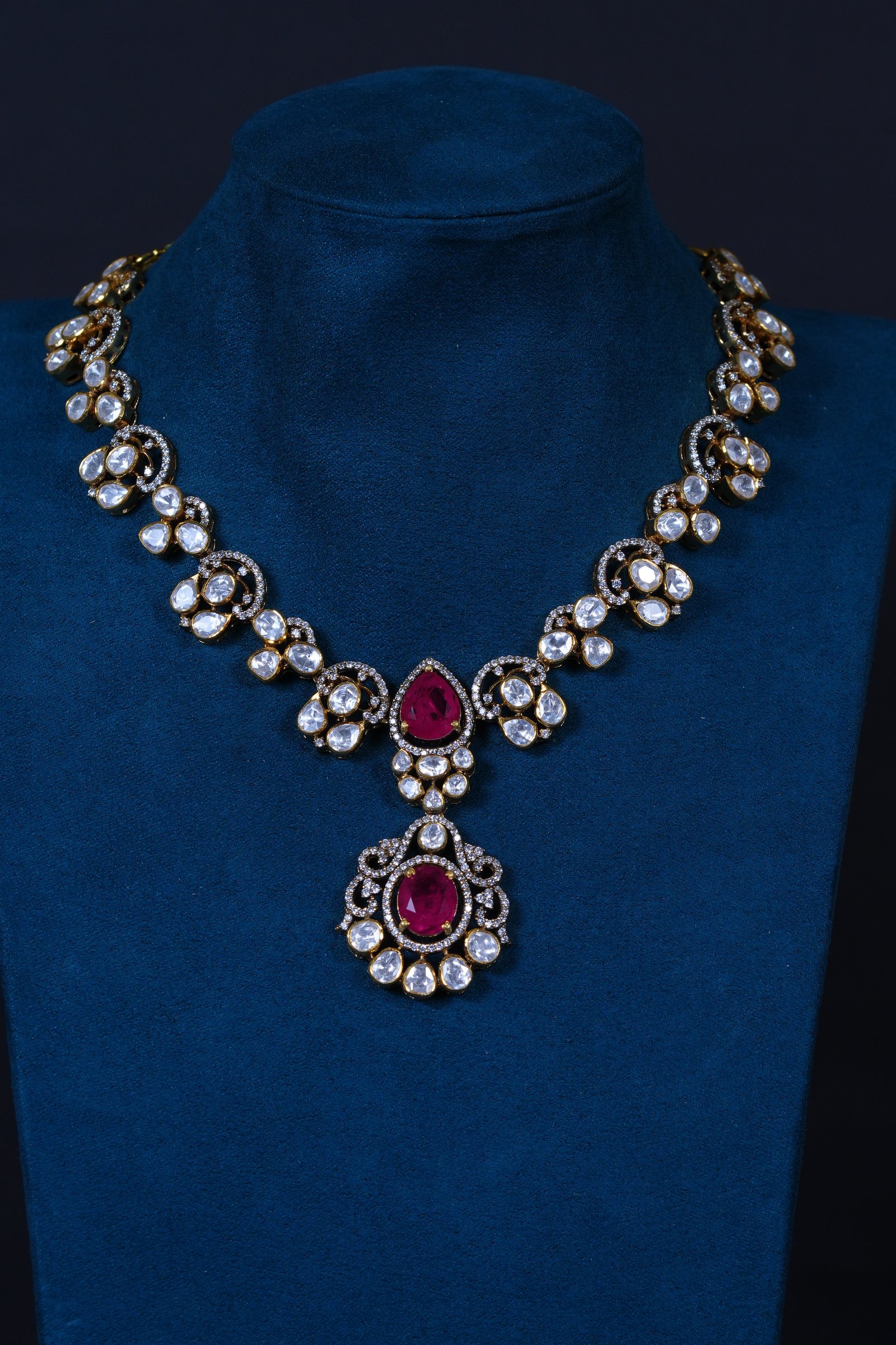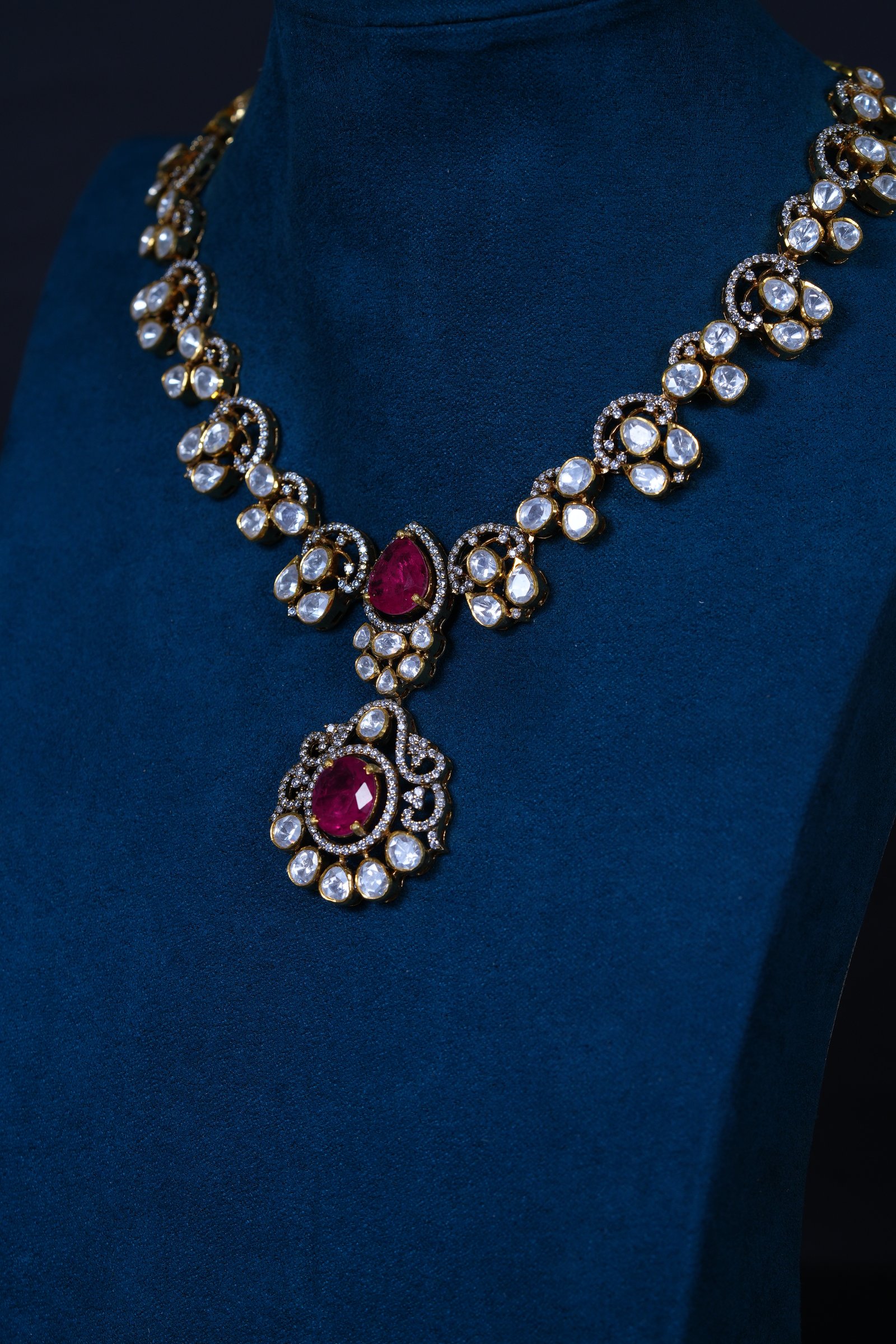 Elegant Polki Ruby necklace with matching earrings crafted in 92.5 sterling silver. A timeless design combining traditional charm with refined sparkle, perfect for weddings and festive occasions.