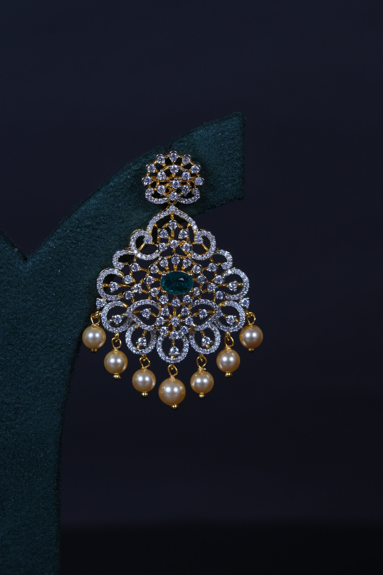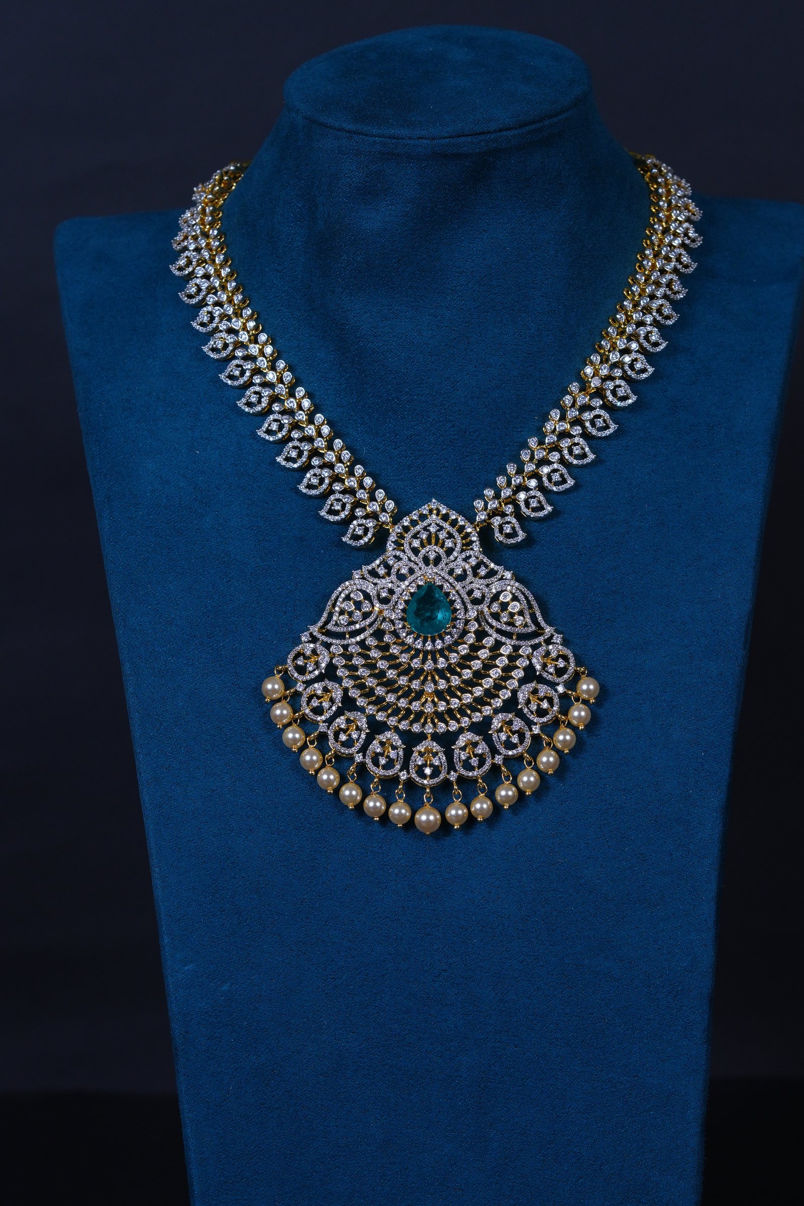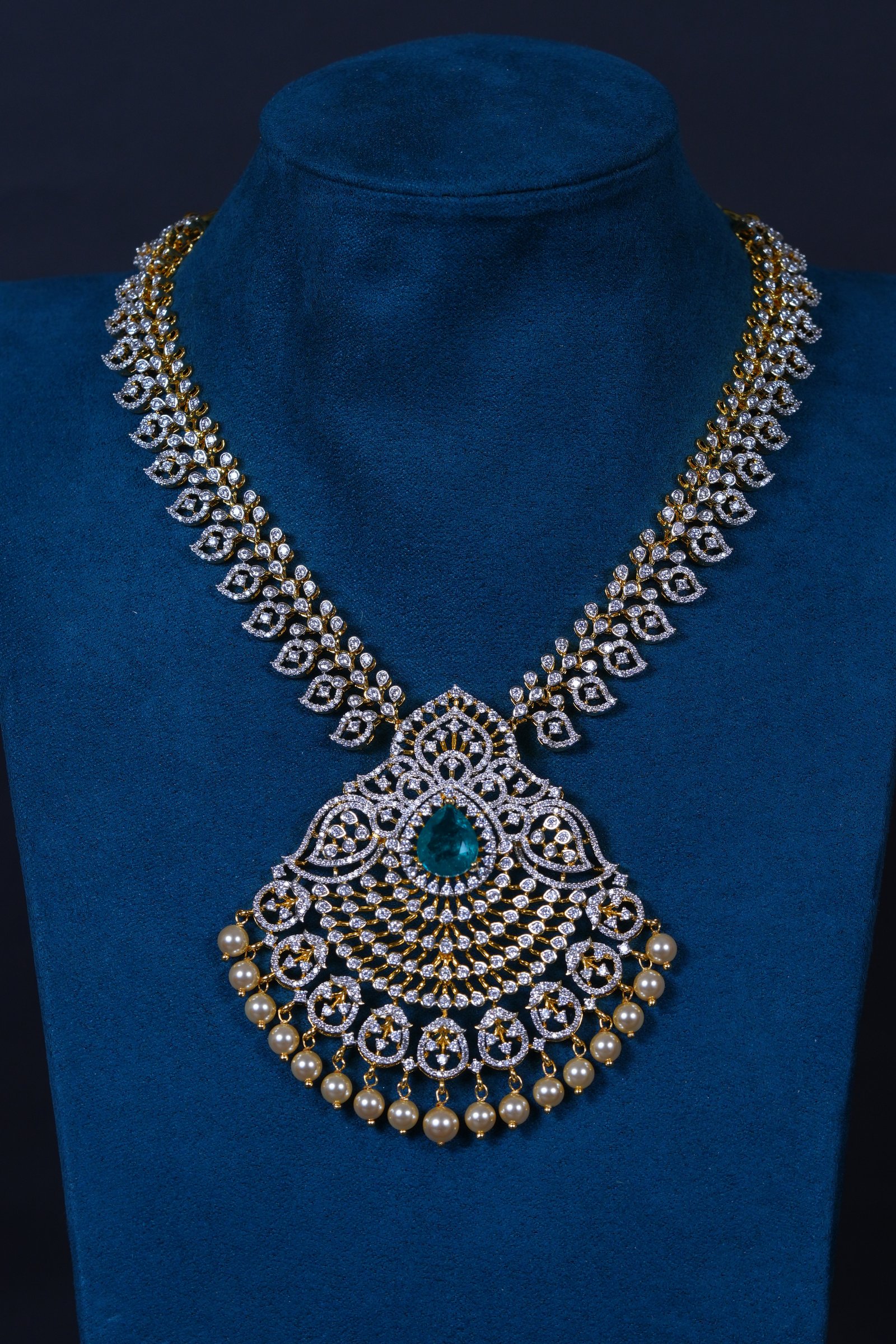 Emerald Mango American Diamond necklace with matching earrings crafted in 92.5 sterling silver. A traditional mango-motif design enhanced with radiant AD sparkle, perfect for weddings and festive occasions.