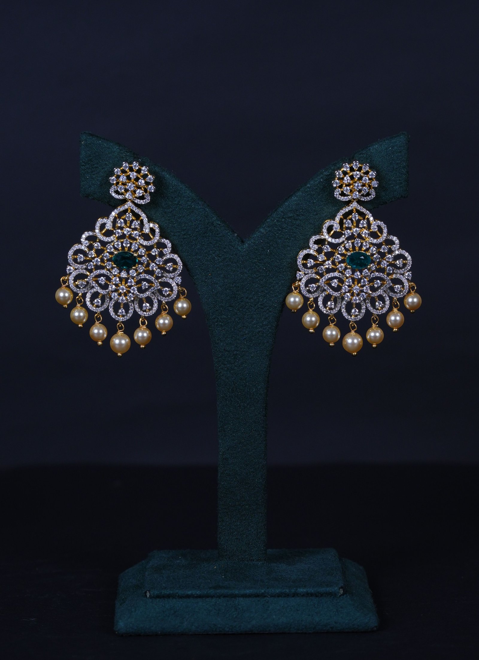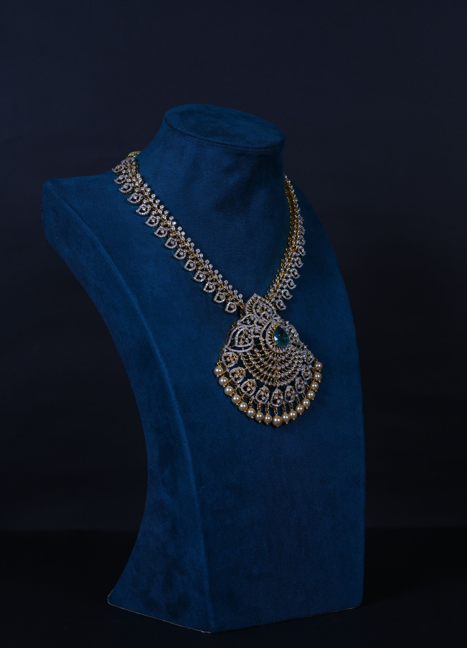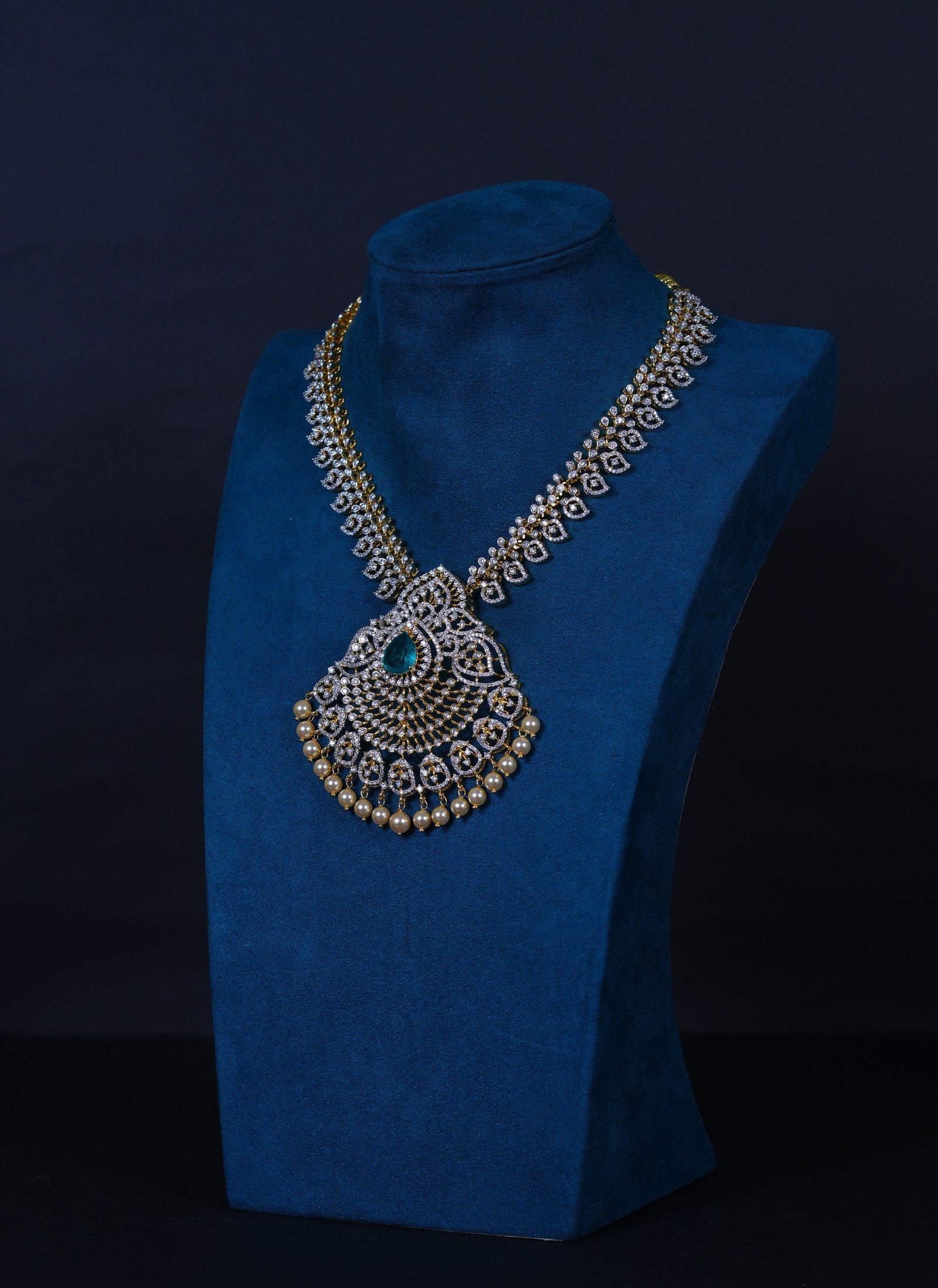 Emerald Mango American Diamond necklace with matching earrings crafted in 92.5 sterling silver. A traditional mango-motif design enhanced with radiant AD sparkle, perfect for weddings and festive occasions.