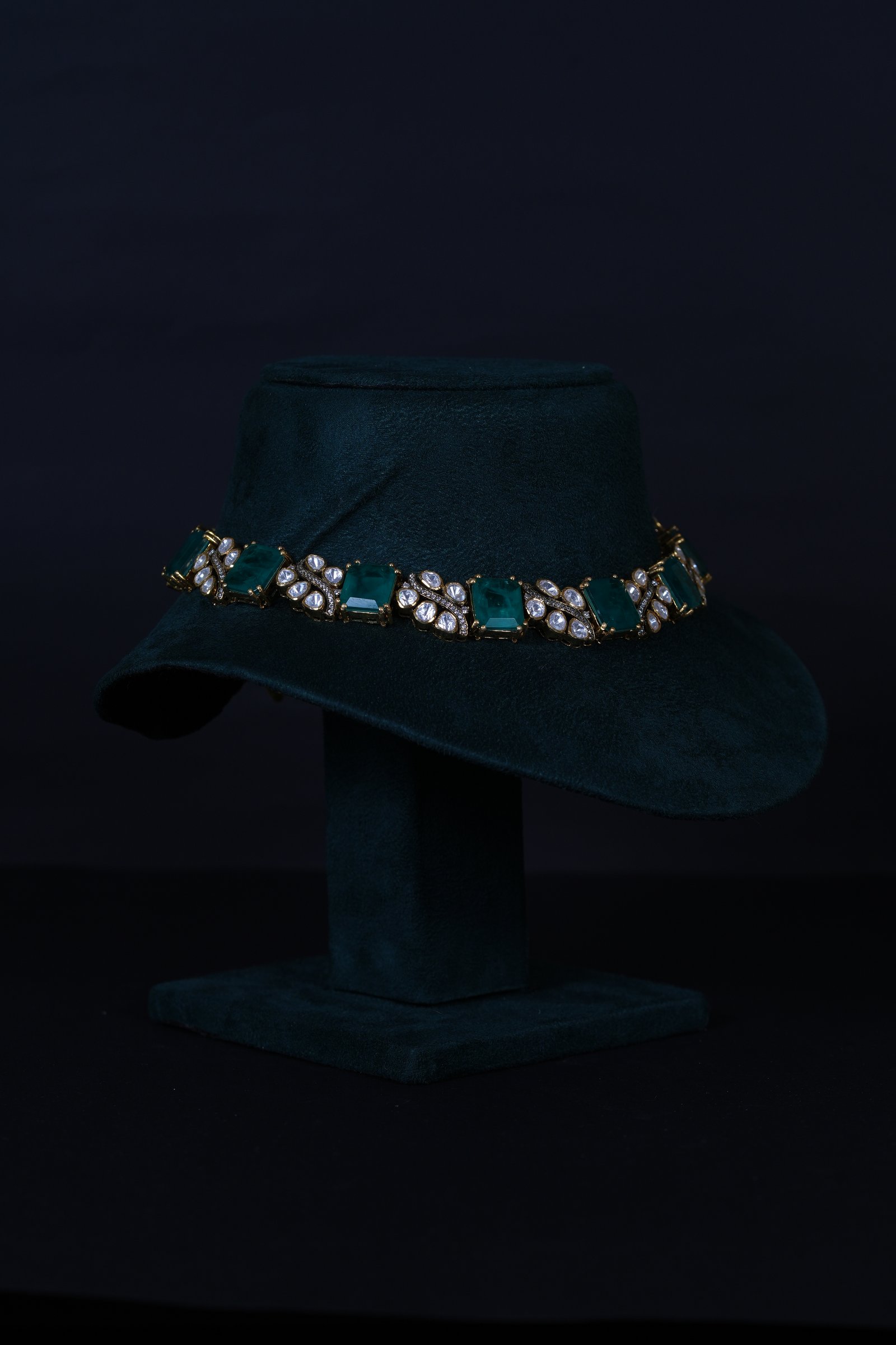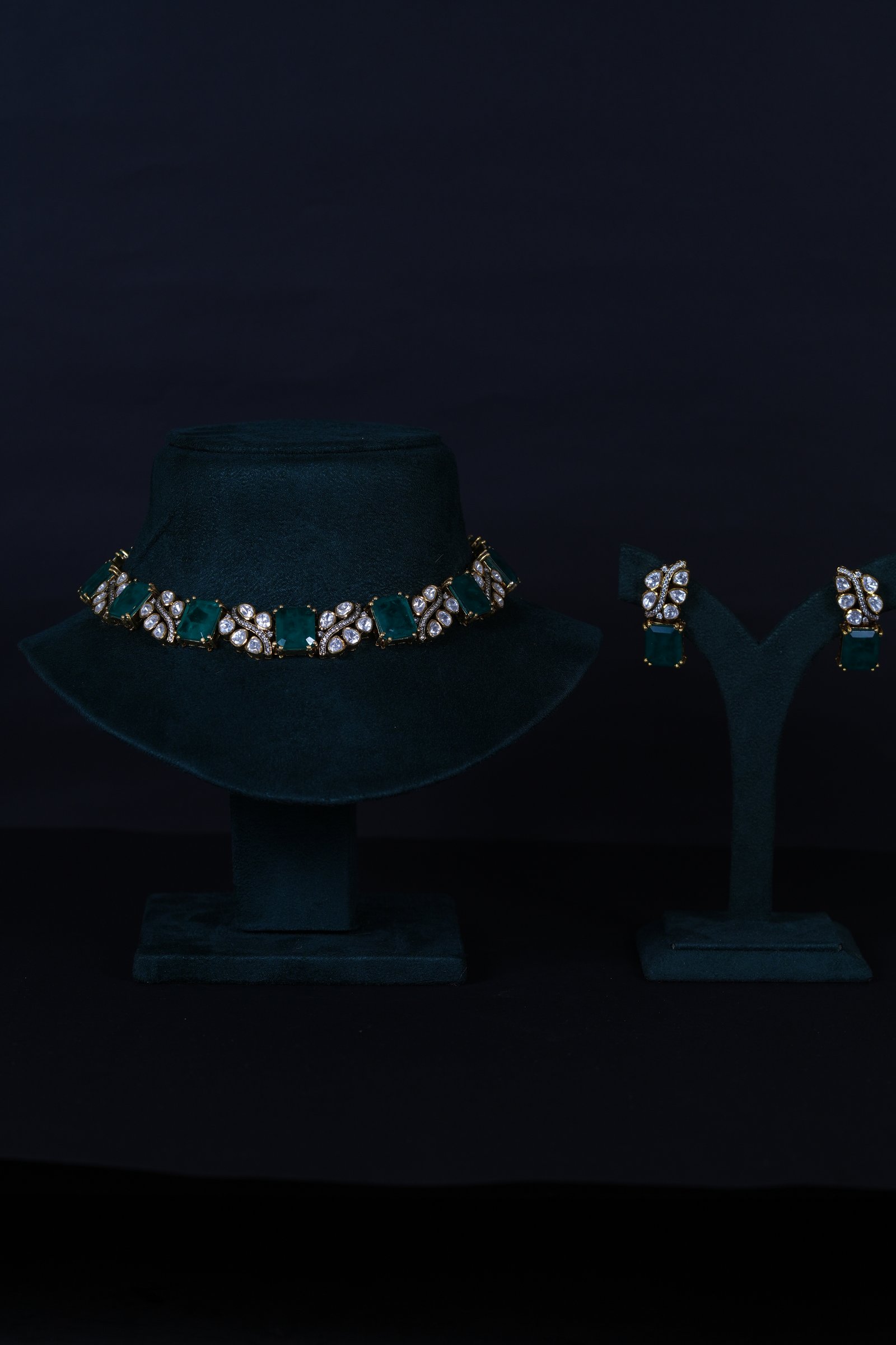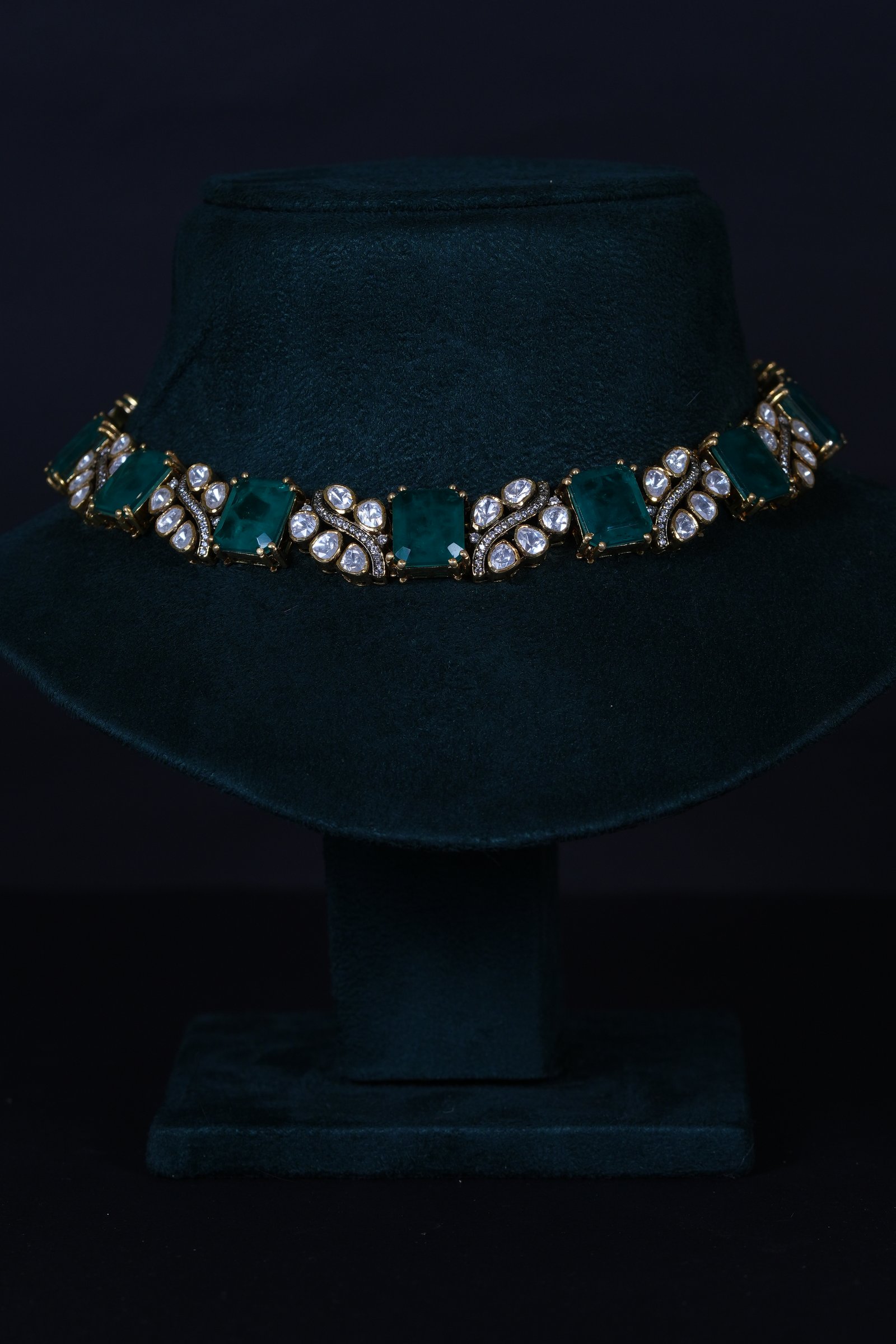 Imperial Russian Emerald Polki necklace set crafted in 92.5 sterling silver. A regal statement design blending rich emerald tones with classic Polki elegance.