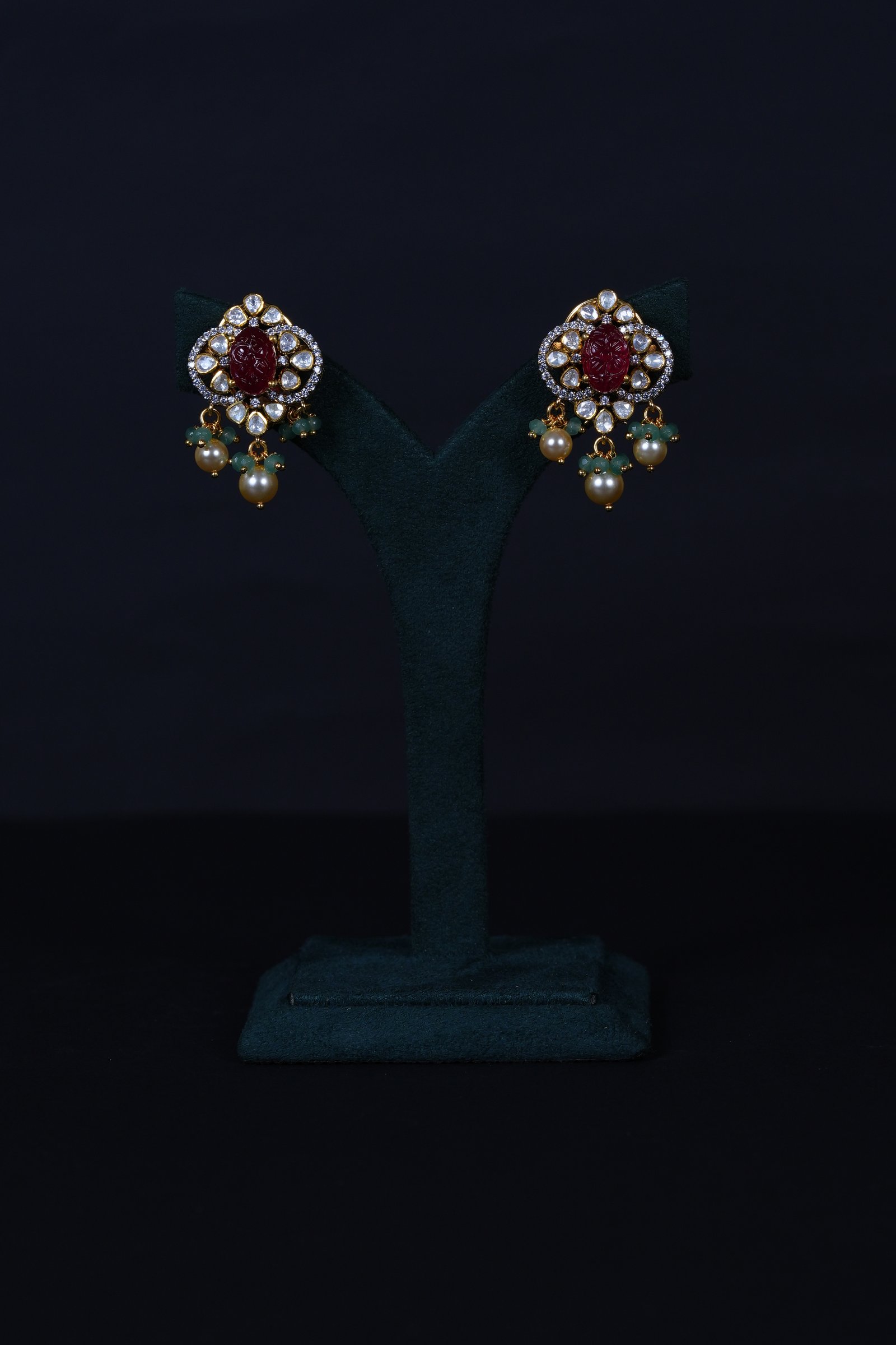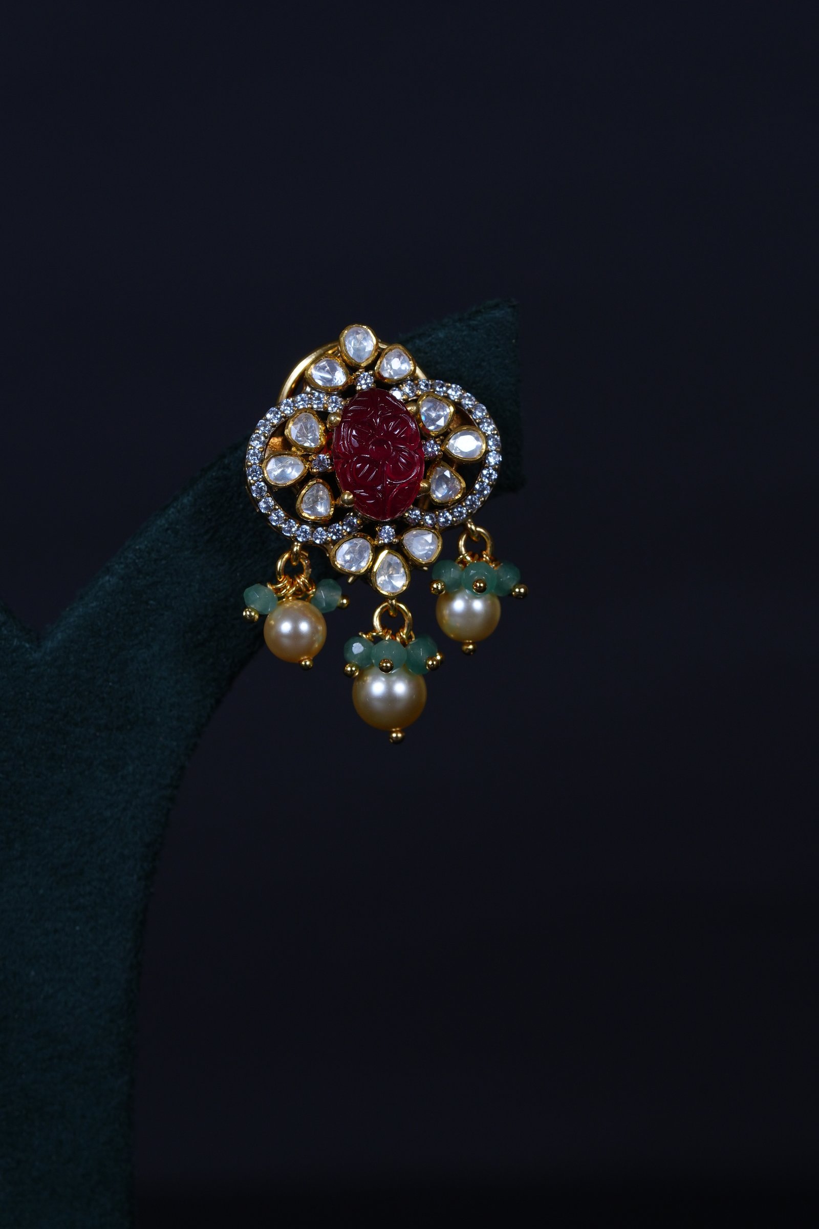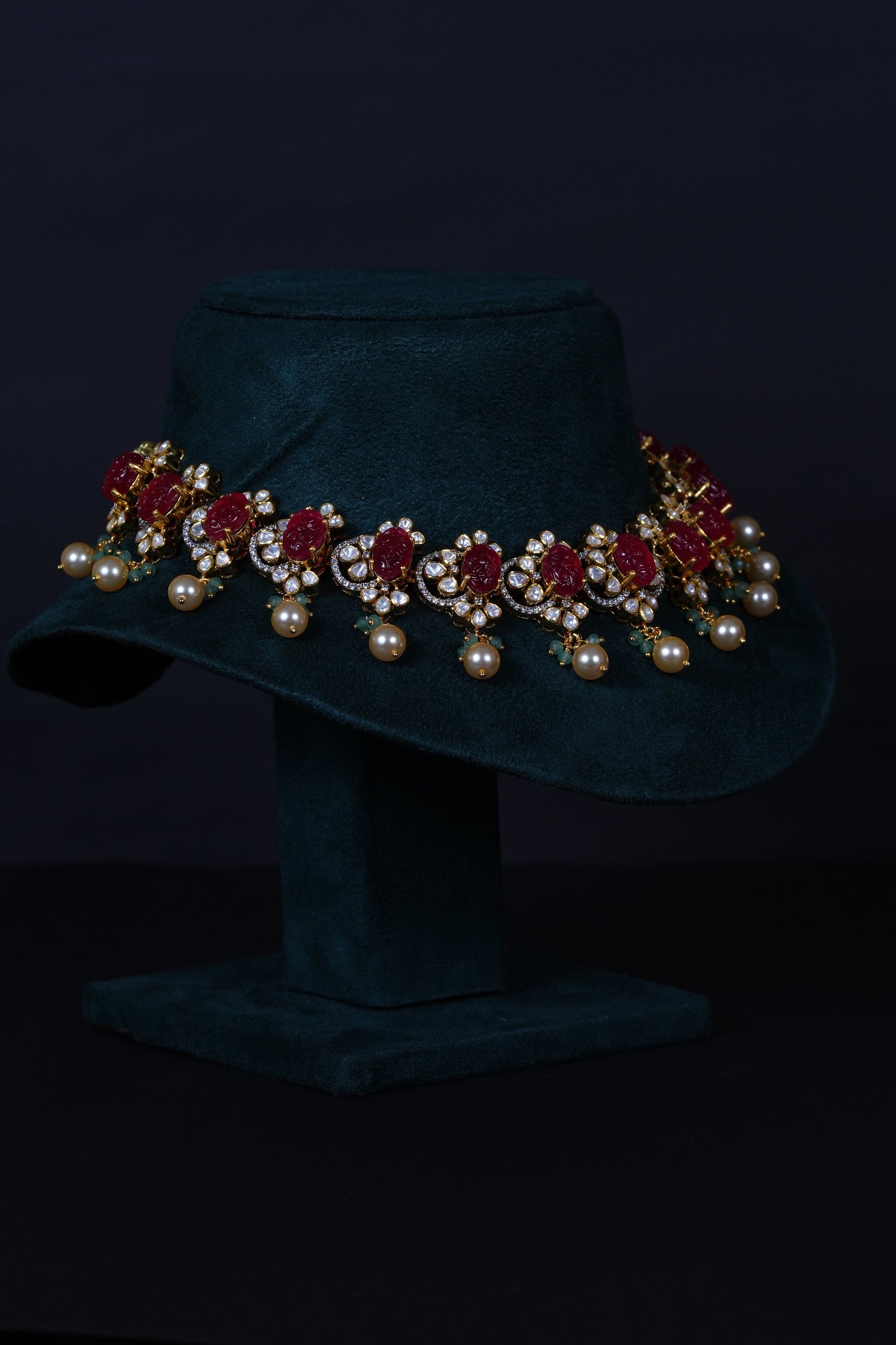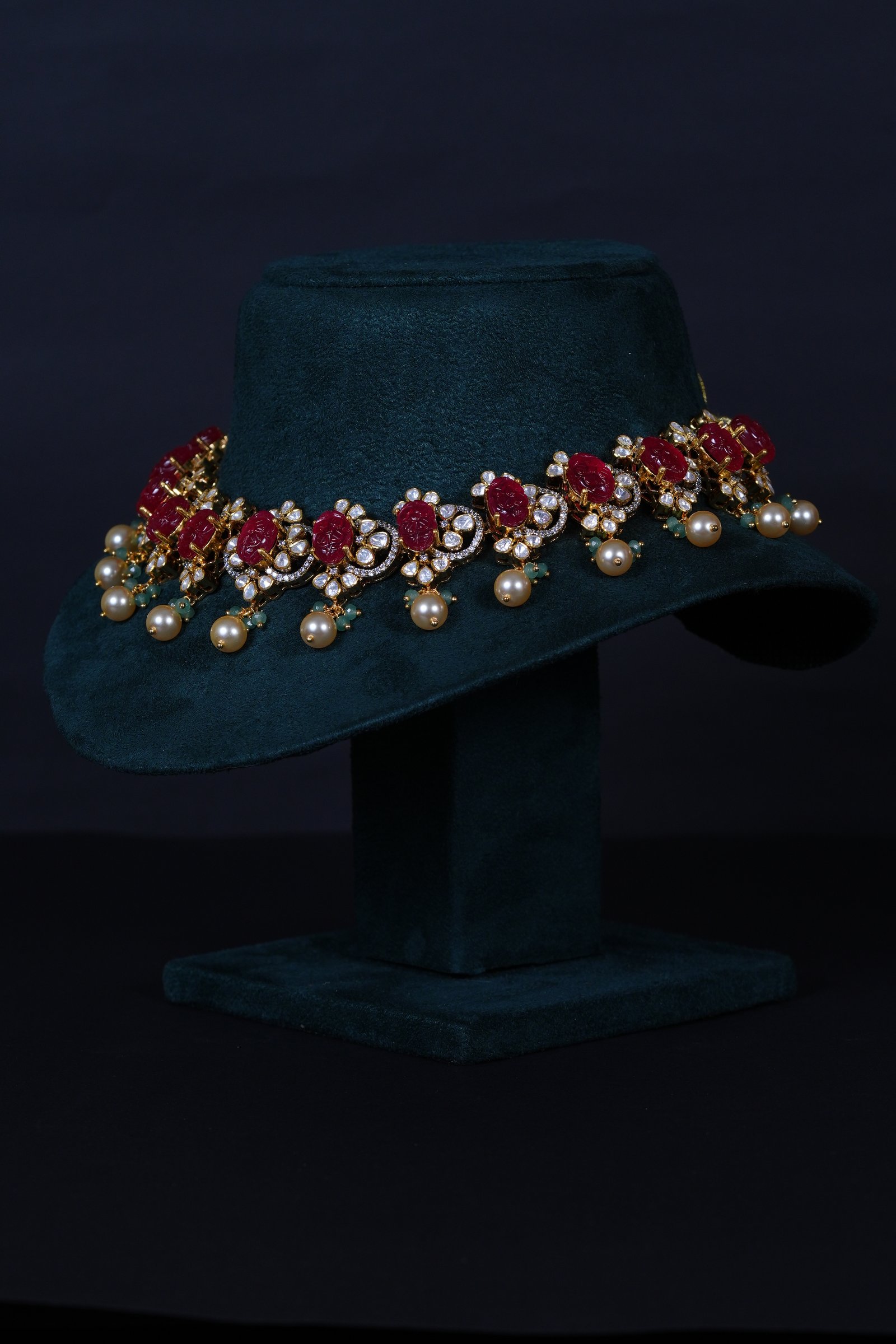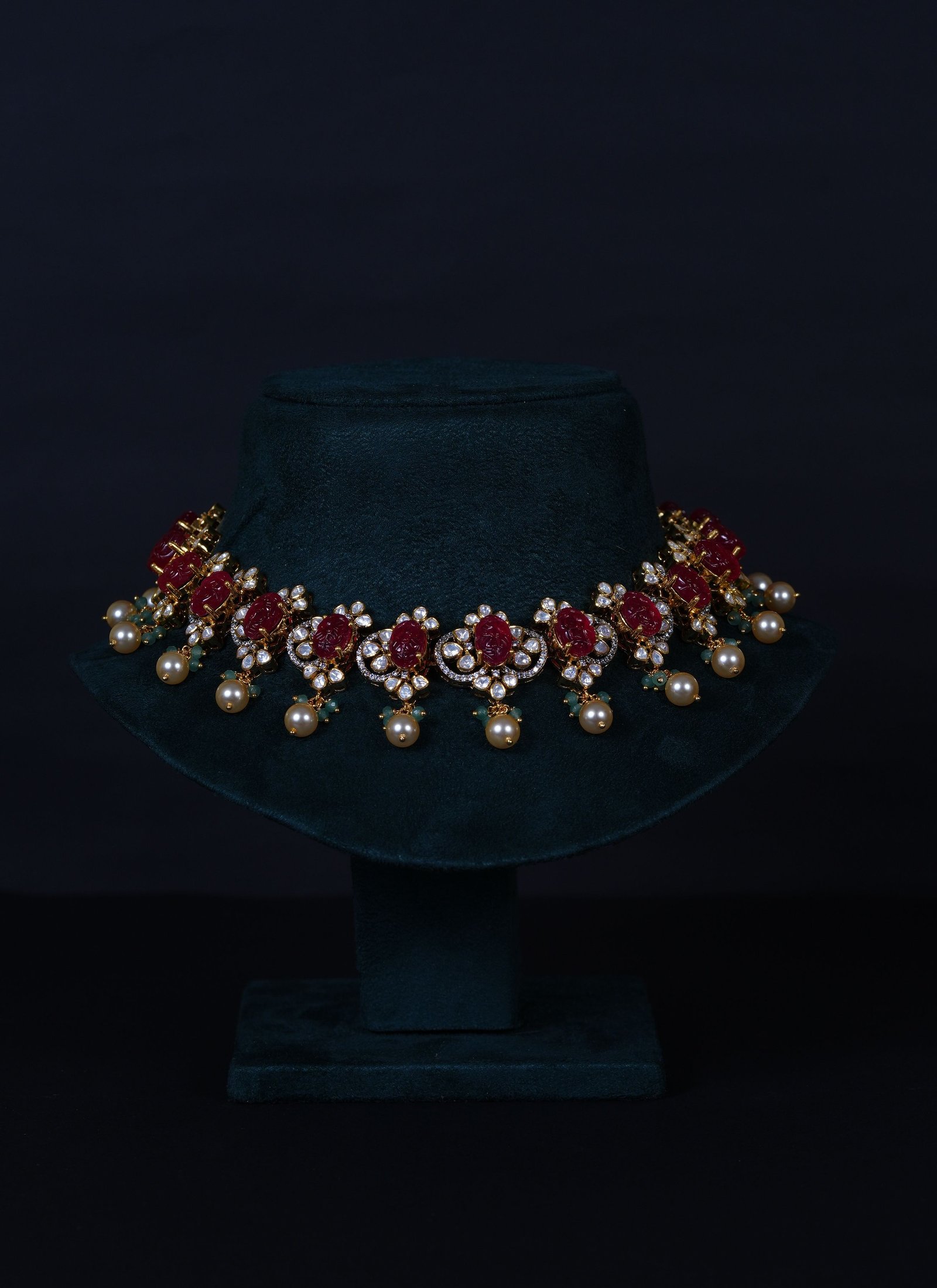 Royal Carved Ruby necklace and earrings set crafted in 92.5 sterling silver, enhanced with brilliant moissanite stones. A bold and elegant statement piece perfect for weddings and grand celebrations.