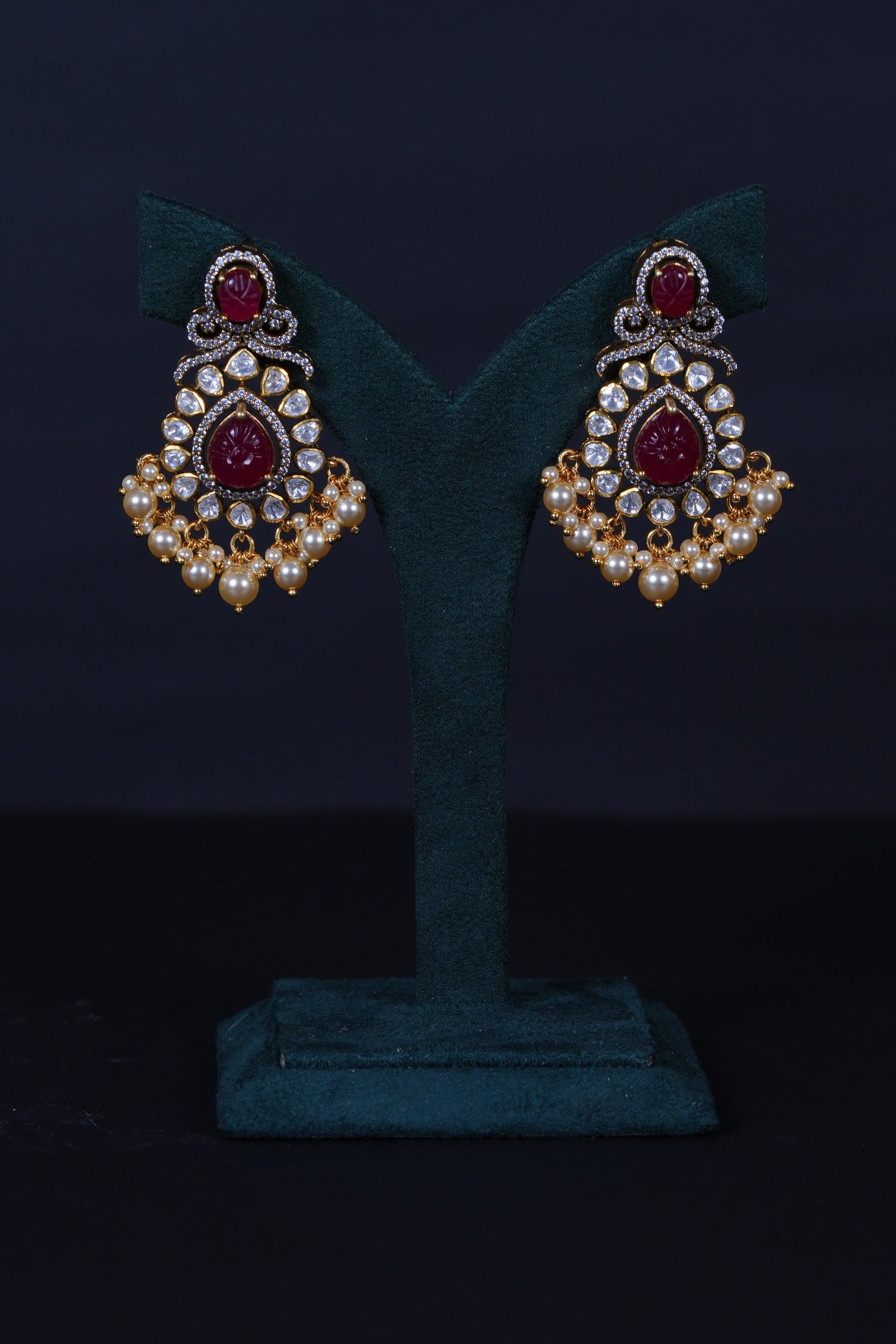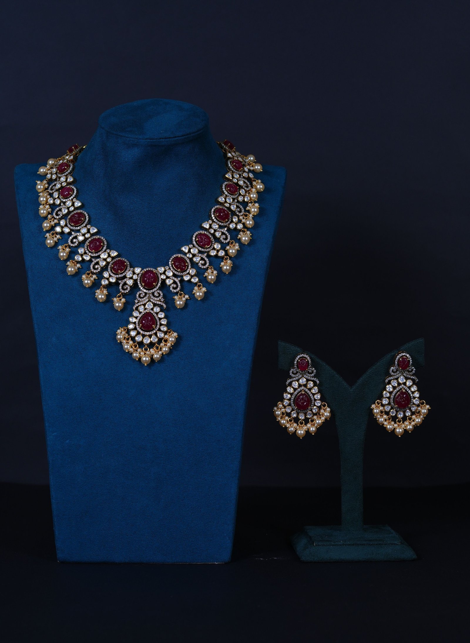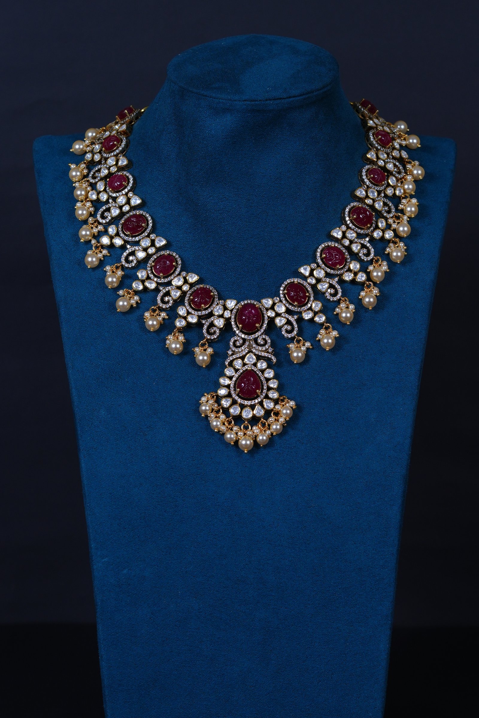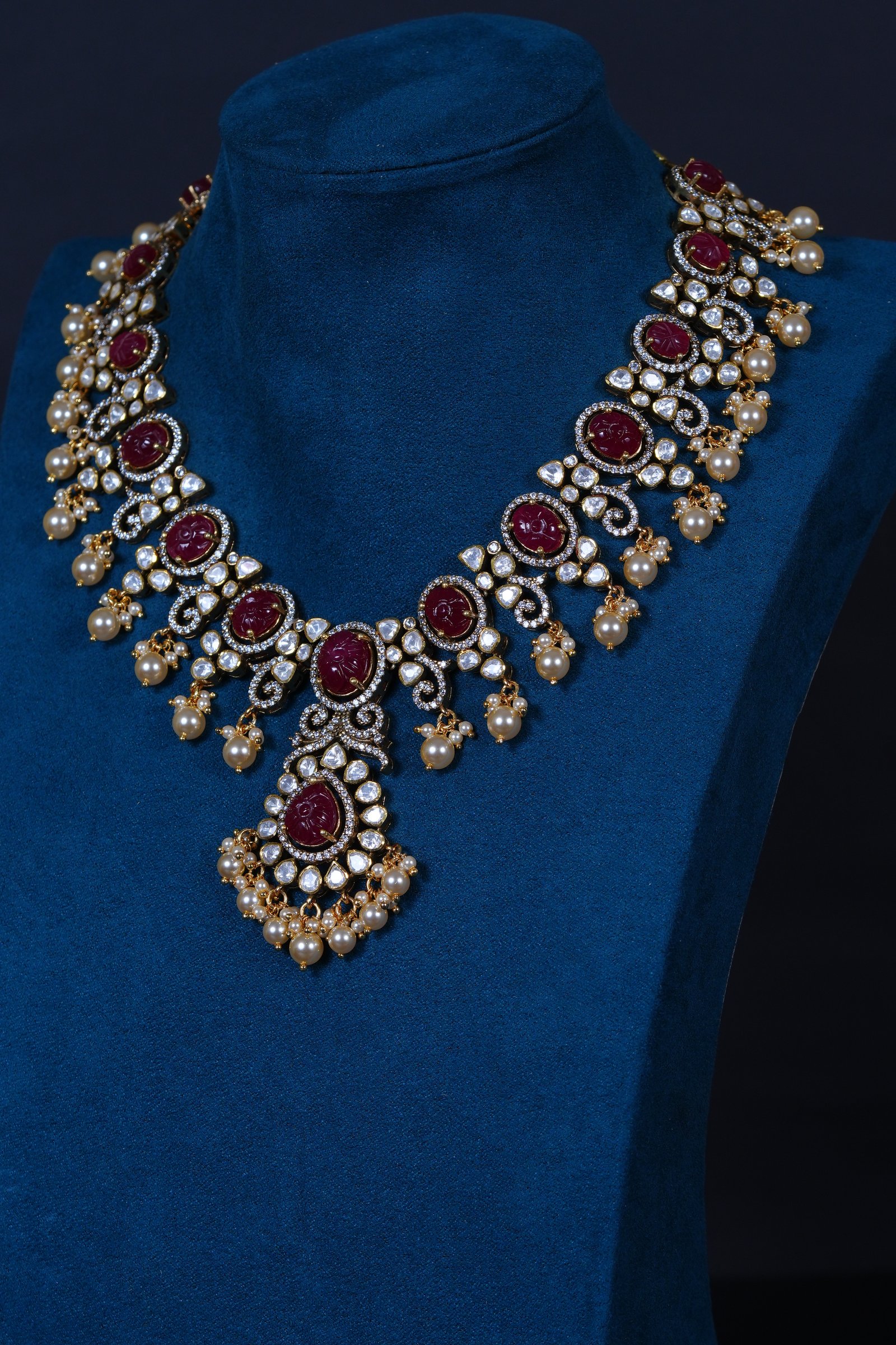 Royal Ruby Carved Polki necklace and earrings set crafted in 92.5 sterling silver. A bold choker-style statement adorned with intricate detailing and elegant pearl accents, perfect for bridal and grand occasions.