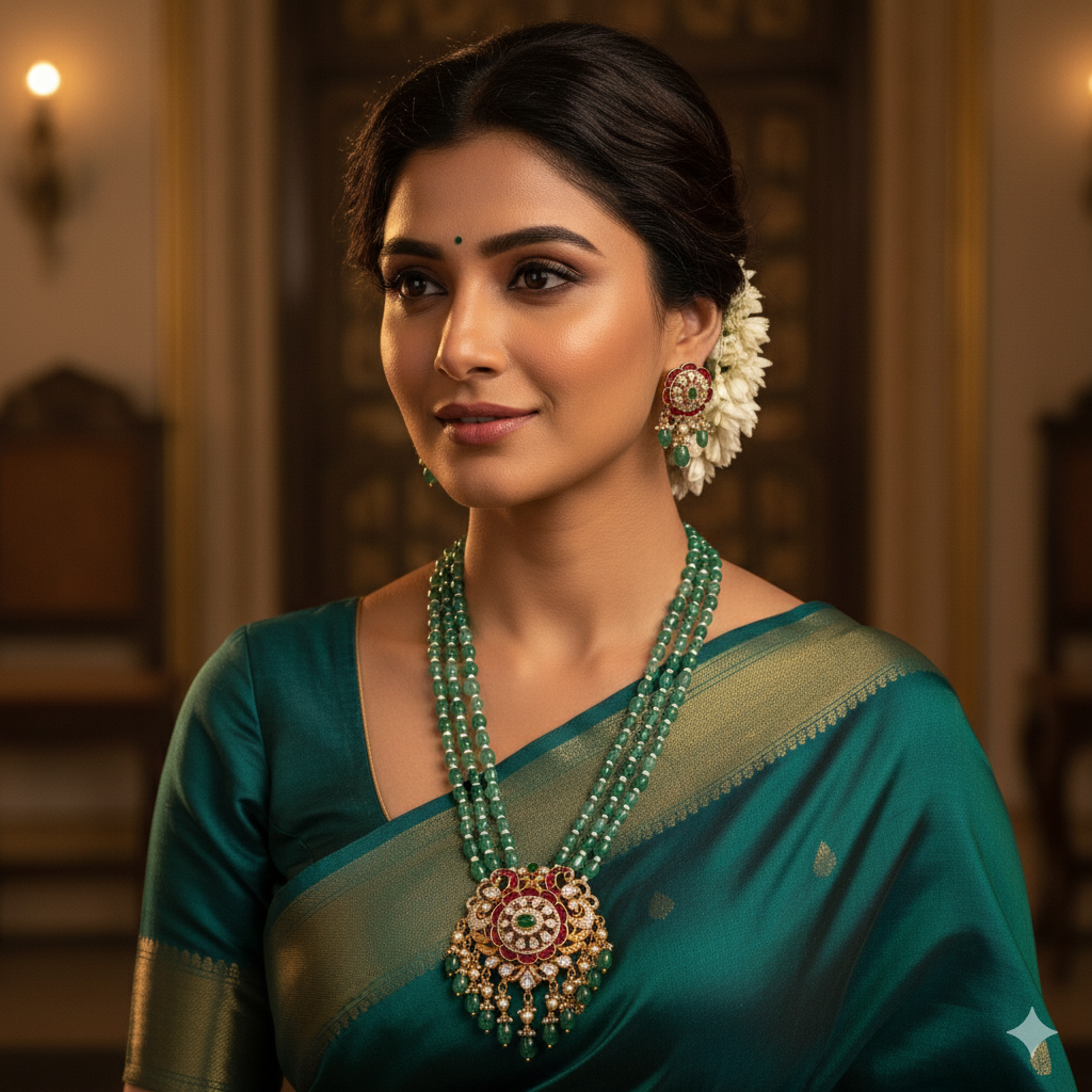 Make a majestic statement with our stunning Multi-Layer Emerald Green Bead Necklace Set. This long, elaborate haar (necklace) features three strands of smooth, polished Green Beads, creating a rich and vibrant look that beautifully contrasts with your attire."
