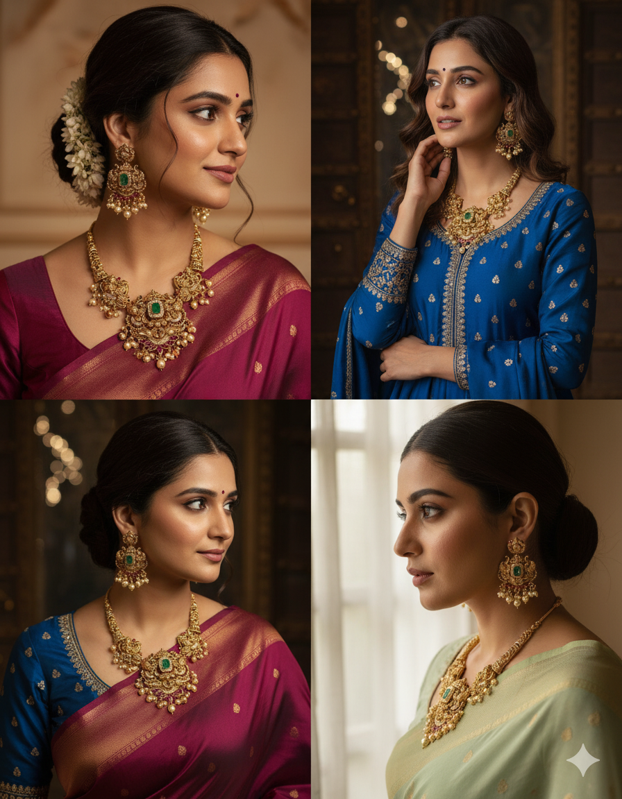 Discover this elegant 1 gram gold temple jewelry set featuring an intricate traditional design with emerald and ruby stones. Perfect for weddings and festive occasions — lightweight, royal, and timeless.